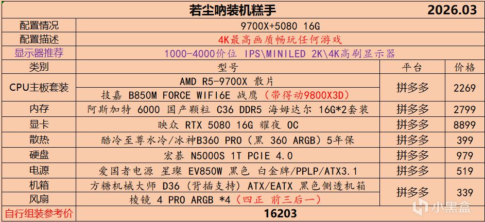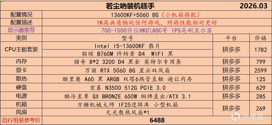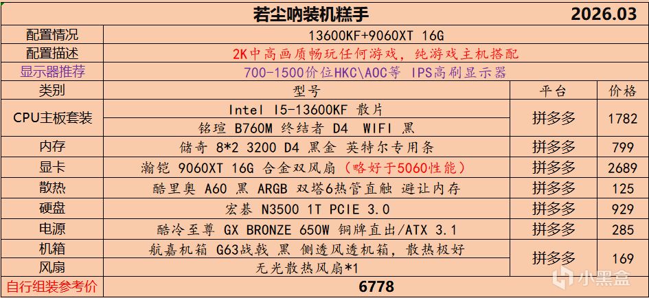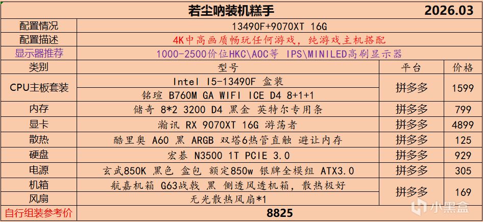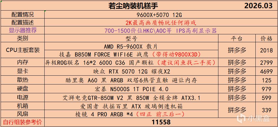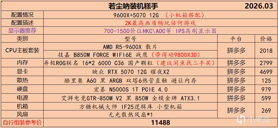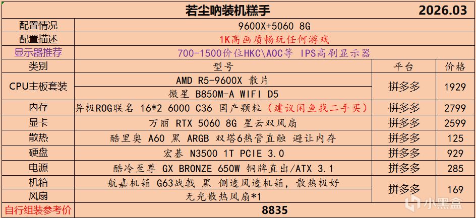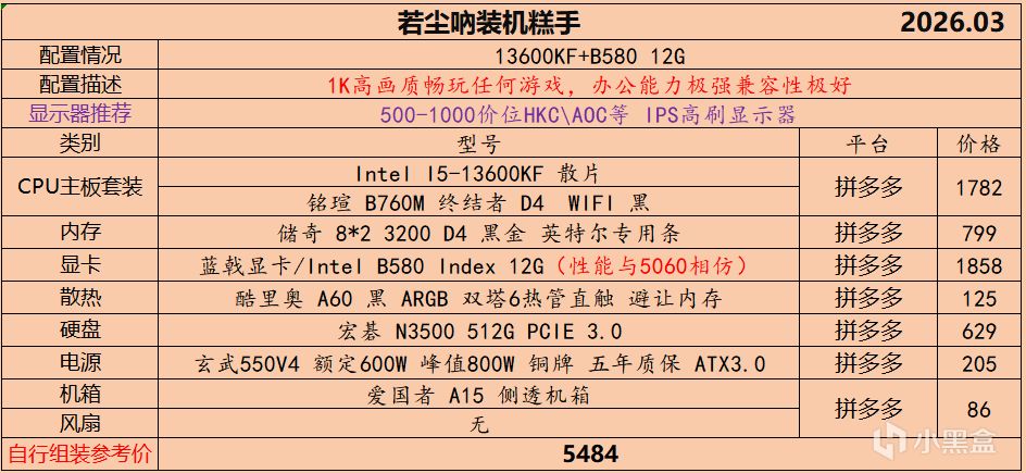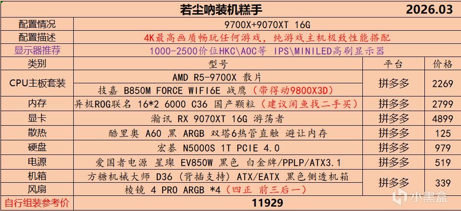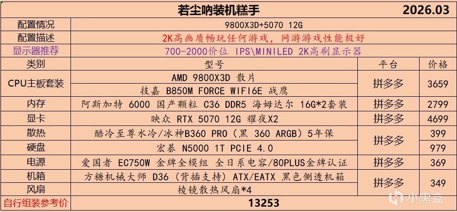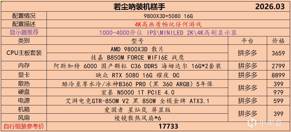 本月就先到这里吧,涨价的太厉害,一个一个找好价太费时间了,相比前些月的搭配推荐可能稍微简化了一些,最近比较忙,时间上来不及,每天也就晚上写一下,就这都搞了五六天,再往后估计还得继续涨价,推荐里面搭配肯定都是没问题的,主要还是价格波动后面会很大,盒友有什么需要的评论区直接留言即可,我会逐一回复,或者我的黑盒群聊里面都可以@我问问题。