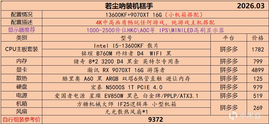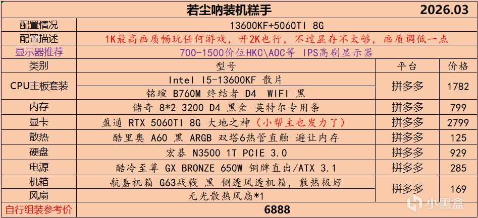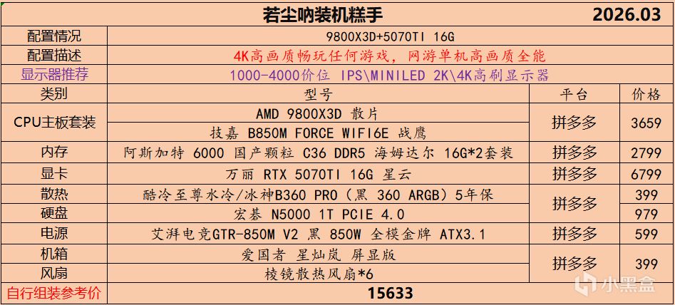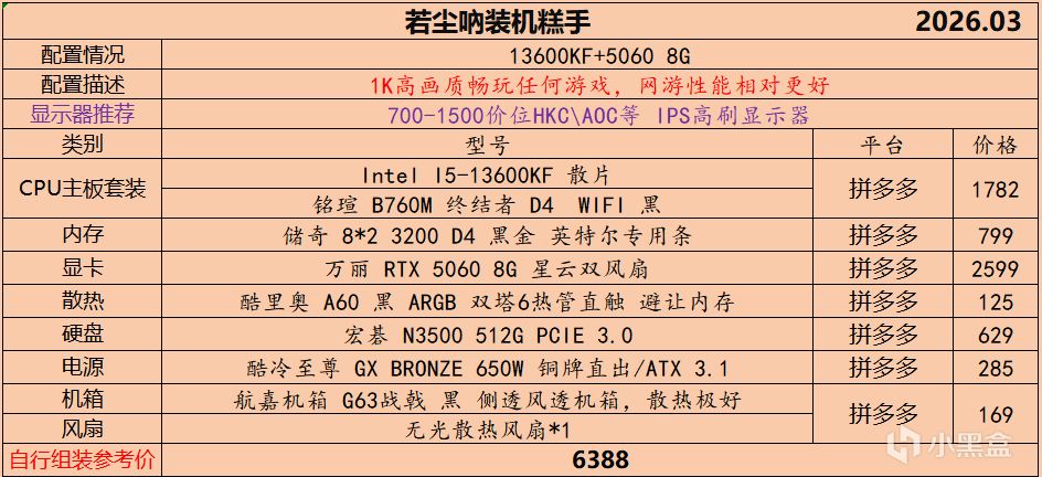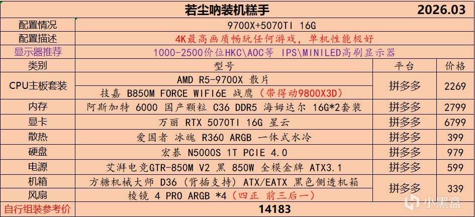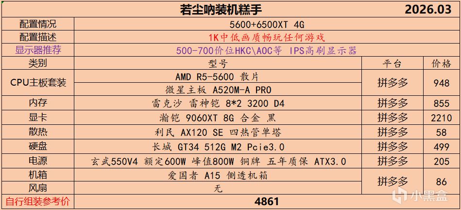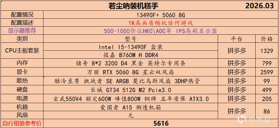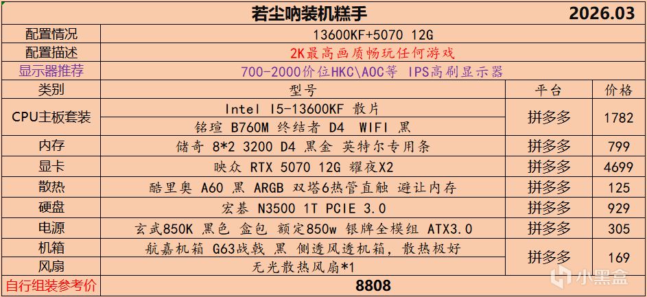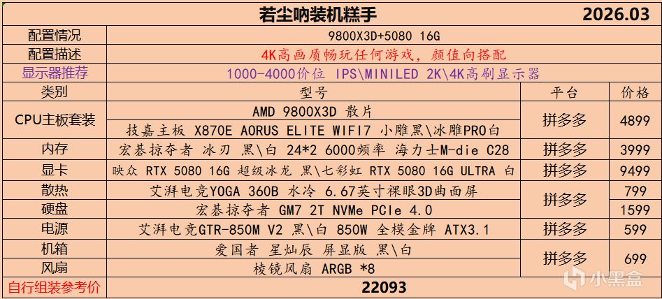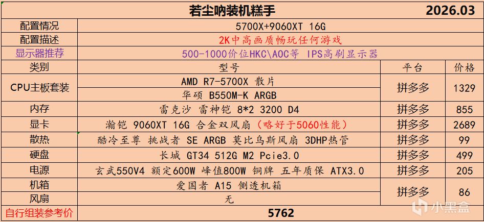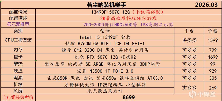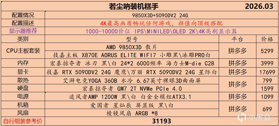 本月就先到这里吧,涨价的太厉害,一个一个找好价太费时间了,相比前些月的搭配推荐可能稍微简化了一些,最近比较忙,时间上来不及,每天也就晚上写一下,就这都搞了五六天,再往后估计还得继续涨价,推荐里面搭配肯定都是没问题的,主要还是价格波动后面会很大,盒友有什么需要的评论区直接留言即可,我会逐一回复,或者我的黑盒群聊里面都可以@我问问题。