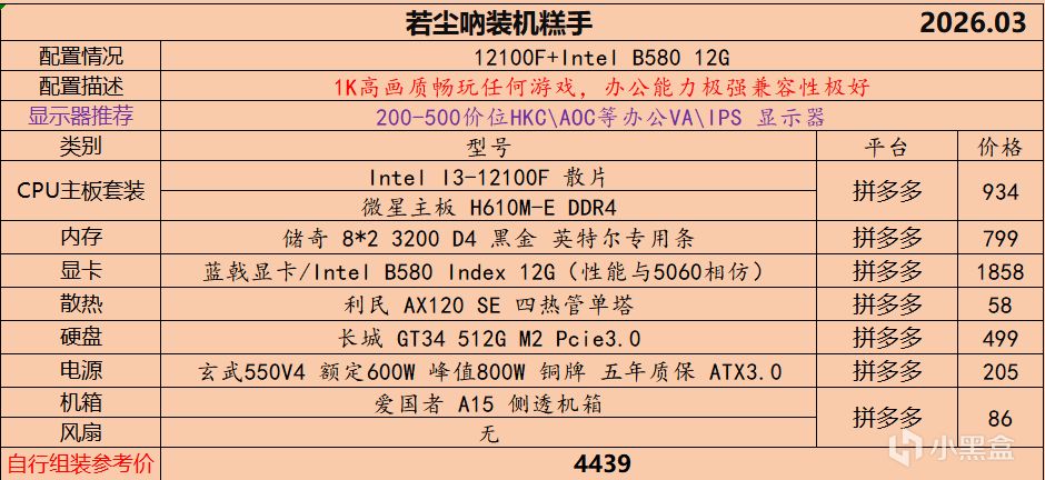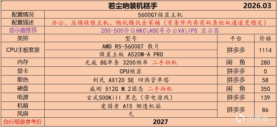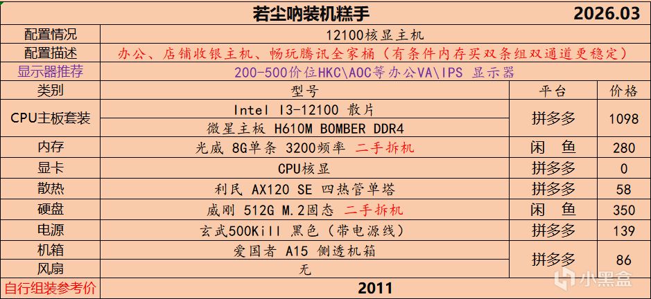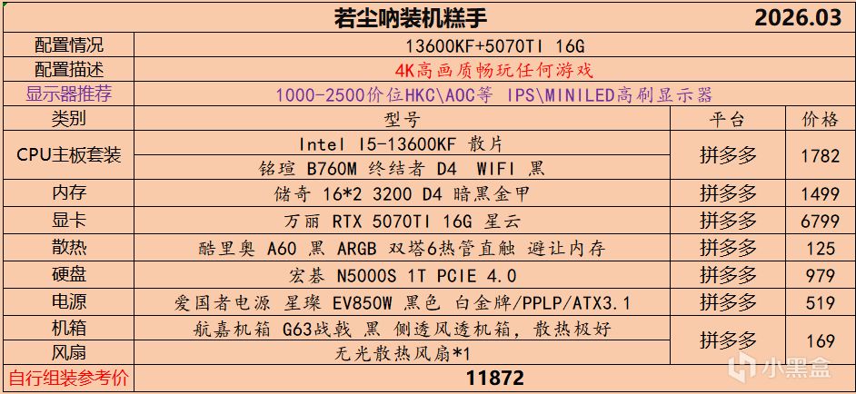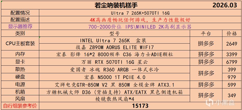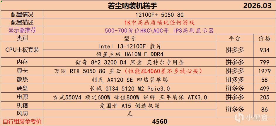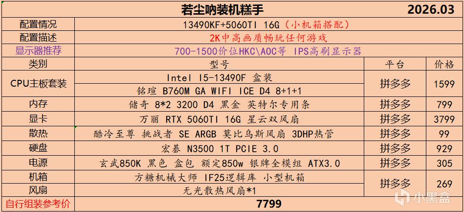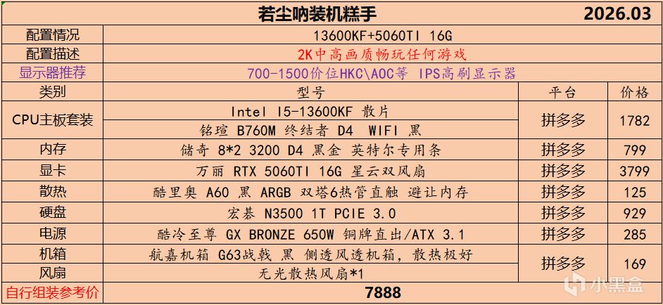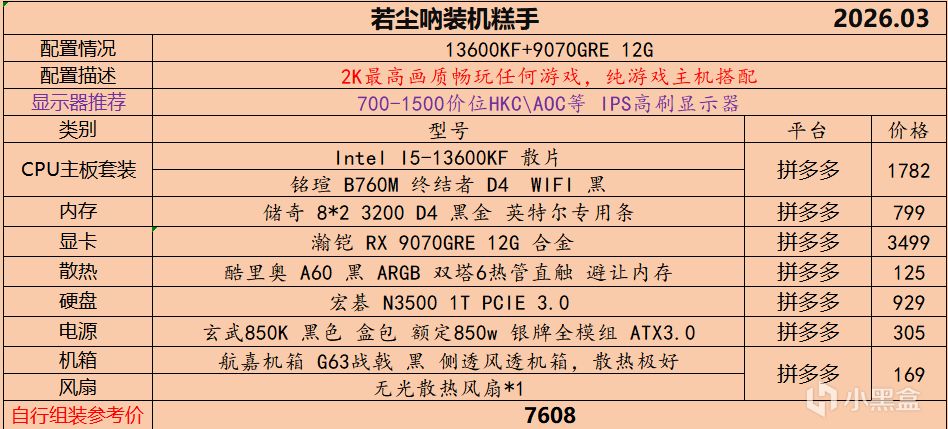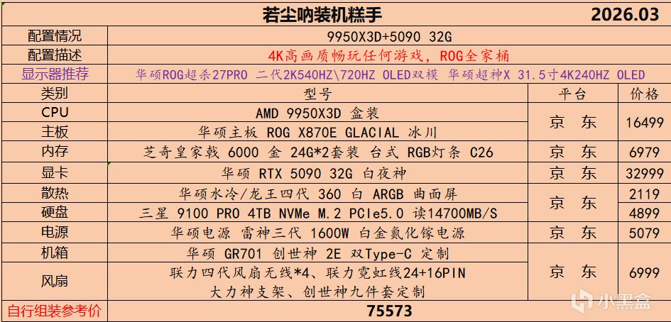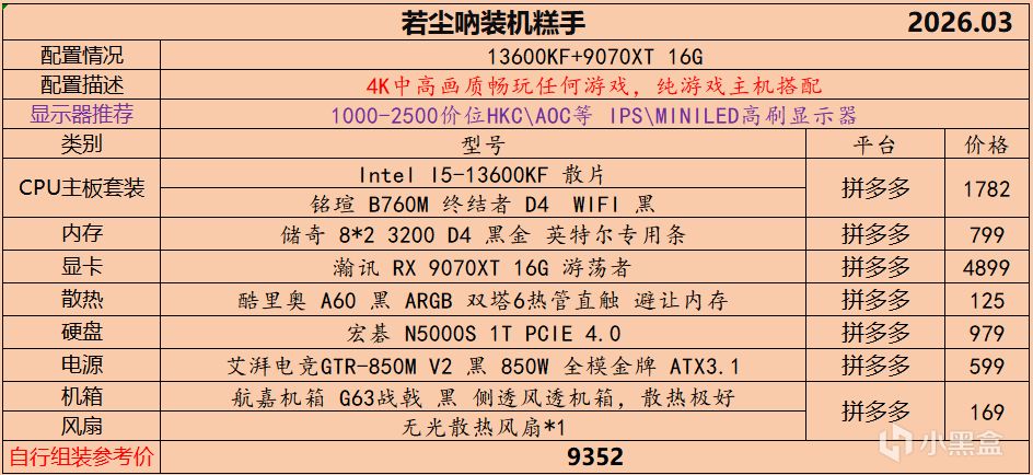 本月就先到这里吧,涨价的太厉害,一个一个找好价太费时间了,相比前些月的搭配推荐可能稍微简化了一些,最近比较忙,时间上来不及,每天也就晚上写一下,就这都搞了五六天,再往后估计还得继续涨价,推荐里面搭配肯定都是没问题的,主要还是价格波动后面会很大,盒友有什么需要的评论区直接留言即可,我会逐一回复,或者我的黑盒群聊里面都可以@我问问题。