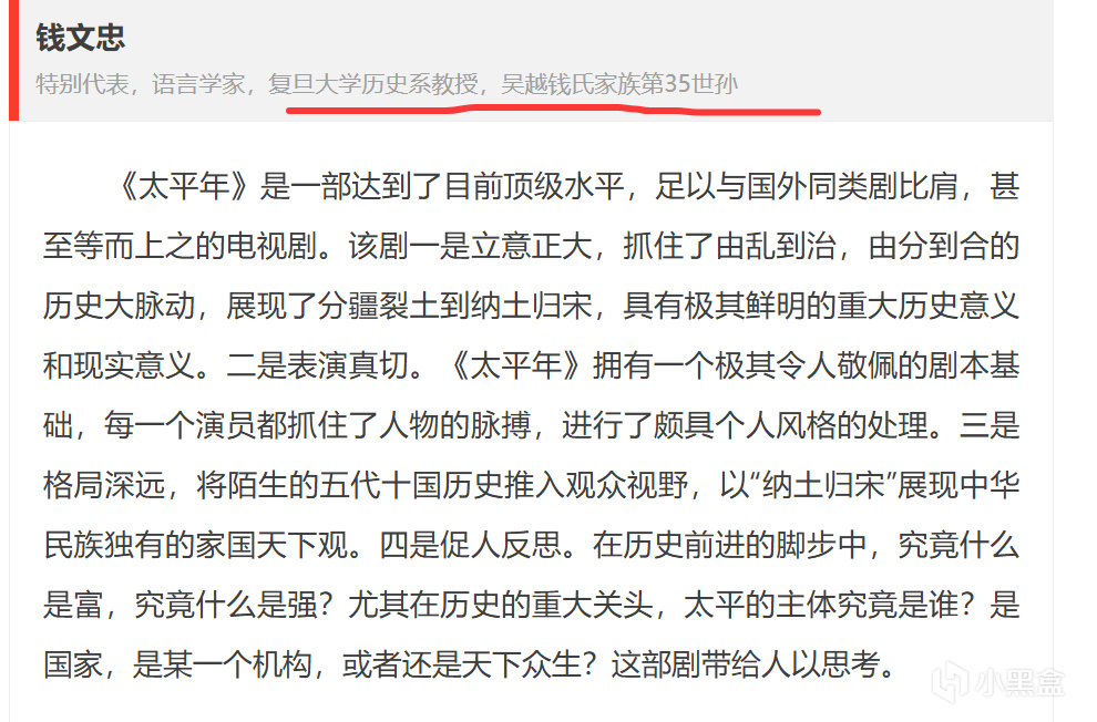 复旦大学教授钱文忠则从史学角度高度认可该剧,认为其立意正大,展现了中华民族独有的家国天下观。
