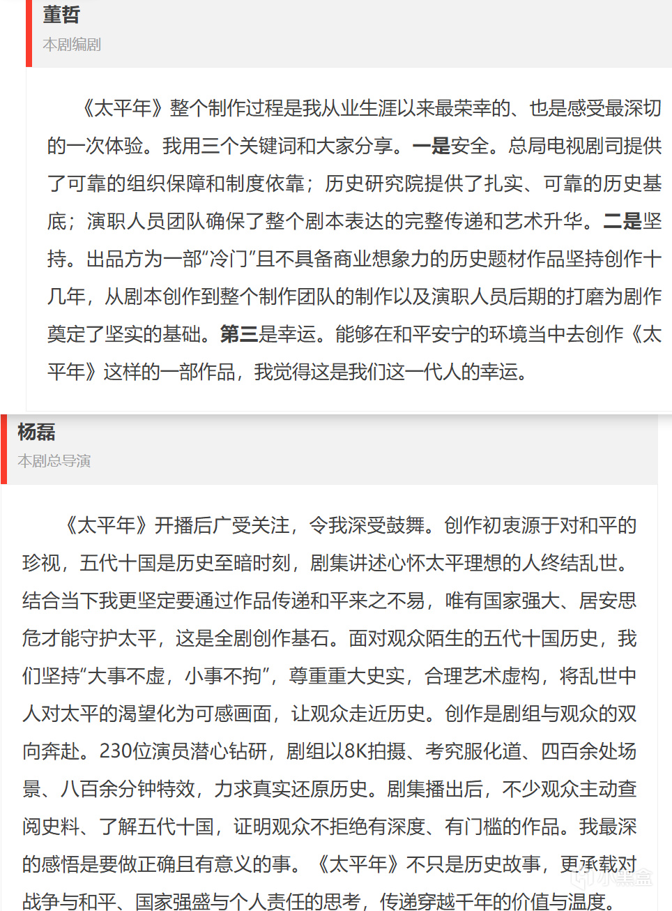 会议最后强调,要总结《太平年》的成功经验,坚持唯物史观,未来打造更多经得起人民和历史检验的历史题材精品。