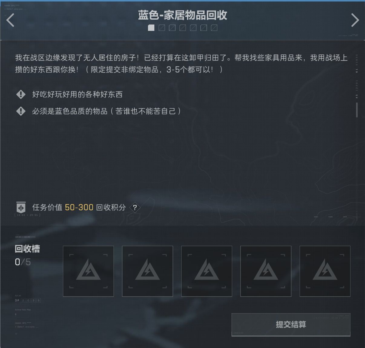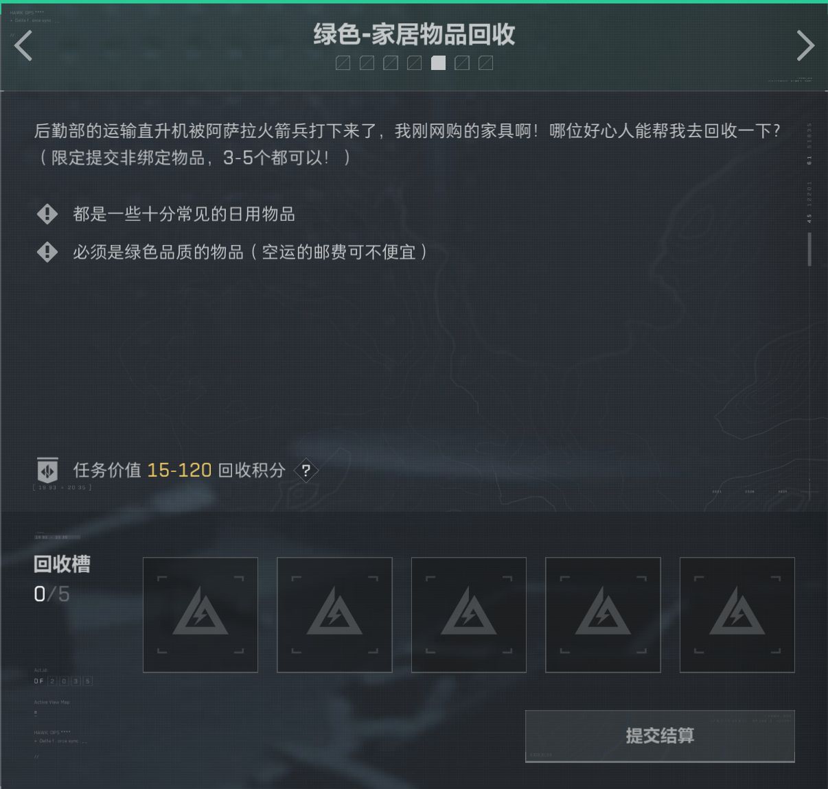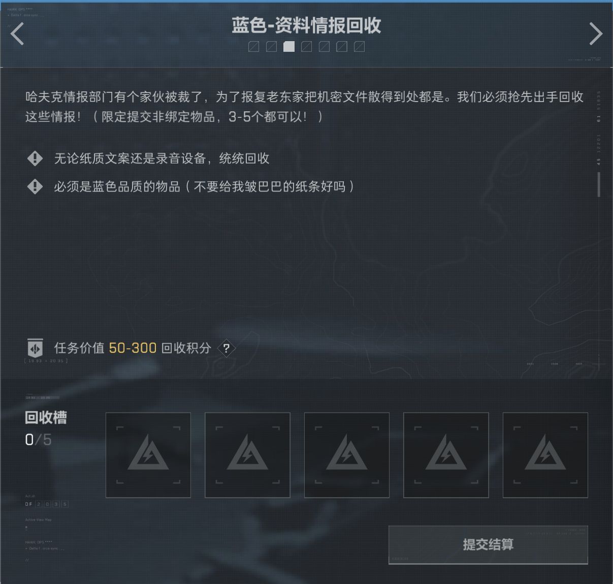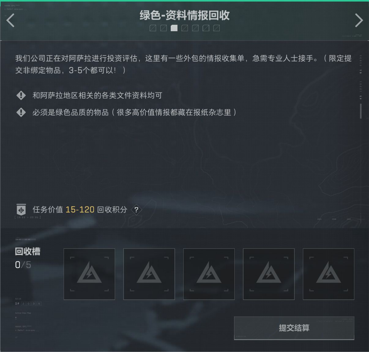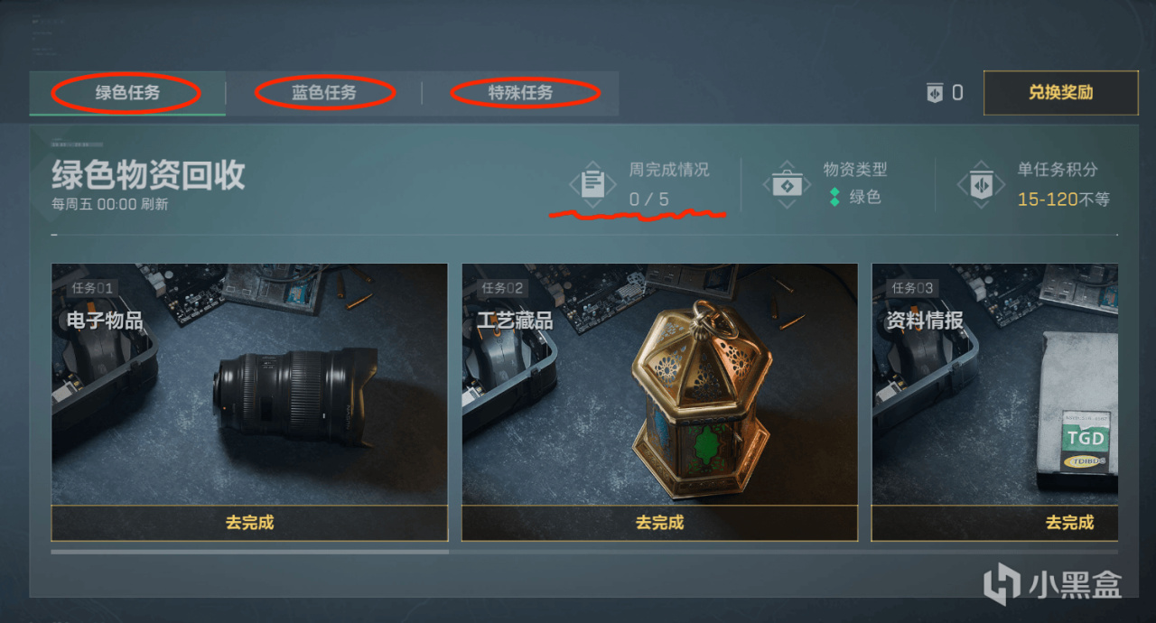 任務分爲綠色/藍色/特殊任務,藍色綠色任務一共7個,可以提交5個。特殊任務可以提交3個.