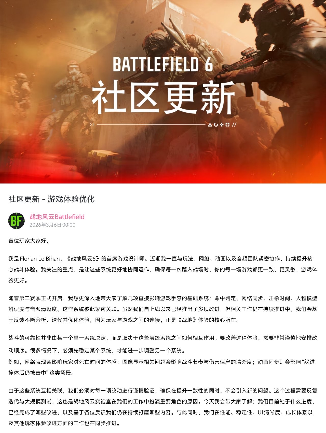如果对于战地六制作组采访有关注的朋友应该知道,前段时间剧组已经聊过,他们近期其实是在承受较大的压力,一方面是在线人数的快速下降,另一方面是游戏本身的好评率一直不够高,因此这次第二赛季其实是能看出他们有更加用心的,不过具体的回坑人数还要看后续集中更新以及这个未来的大更新什么时候会上线。