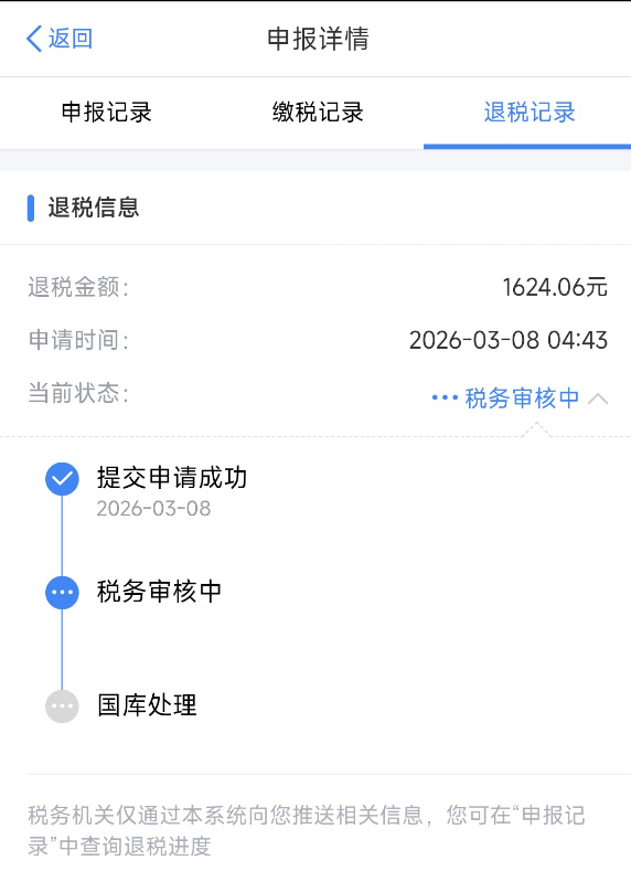 给大家看一下,我今年已经申报完成并且成功退税1624.06元