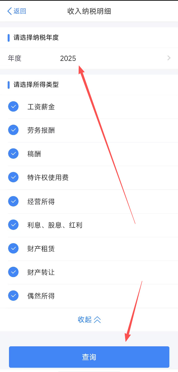 年度选择2025年,所有收入全部勾选,然后点击查询
