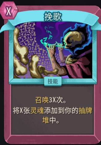 核心思路是,利用【唤起】一费赚到多费,在费用极多的情况下打出【挽歌】,得到更多张【灵魂】。利用【灵魂】一张卡可以过两张卡的特性,过空整个卡组多遍,得到更多的【唤起】,更多的【唤起】赚到比更多的能量,在【挽歌】中得到更多的【灵魂】。