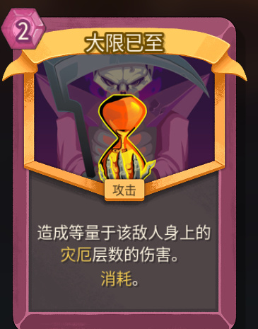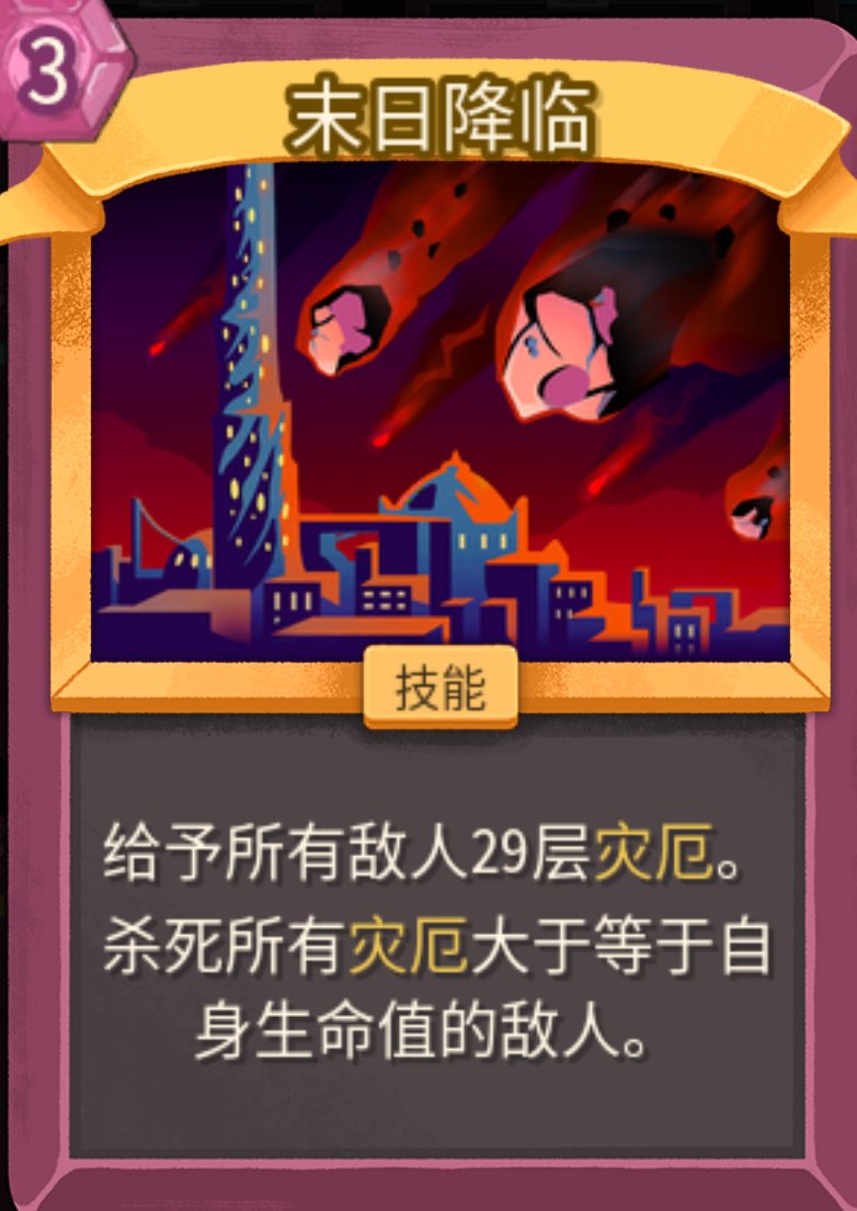 注意,灾厄判定在敌人的回合结束,也就是说,敌人在生命值小于灾厄层数的时候,还可以打出最后一次攻击。你可以通过使用末日降临避免这种情况。