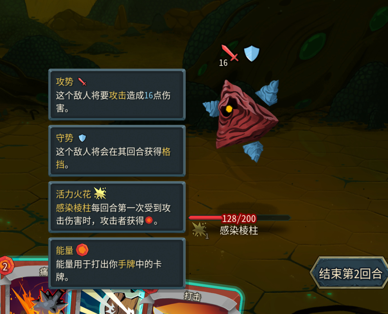 这个精英除了血厚,特性是自带火力火花,每回合第一次被打掉血,会给我们补能量,基本约等于无负面效果加费,经过一层的补强过的卡组,一般打着不会有太大压力。