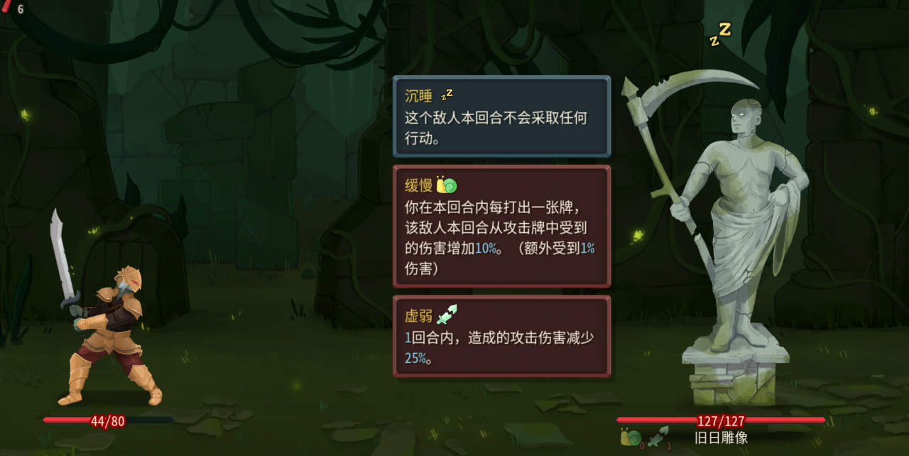 旧日雕像有上版本大头的缓慢buff,每多打一张牌就会增加本轮伤害,所以打的时候先拍防御卡,最后再打输出。整体血量很高,沉睡结束之后,冲上来刀刀重击,输出不够很容易被大入血,甚至是直接被抬走。