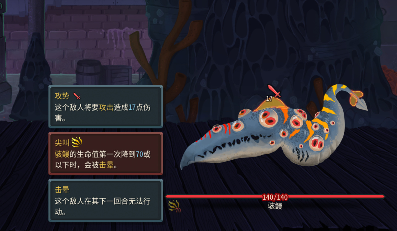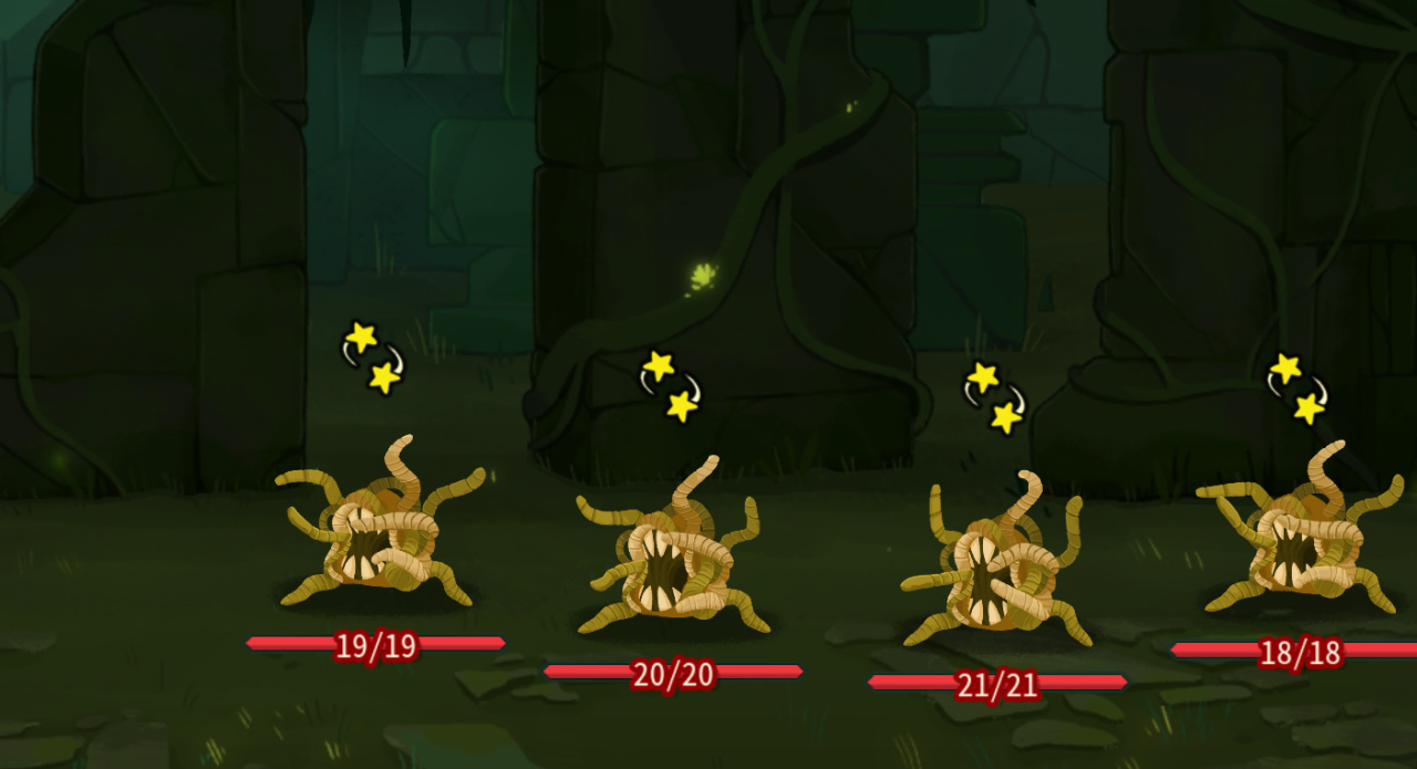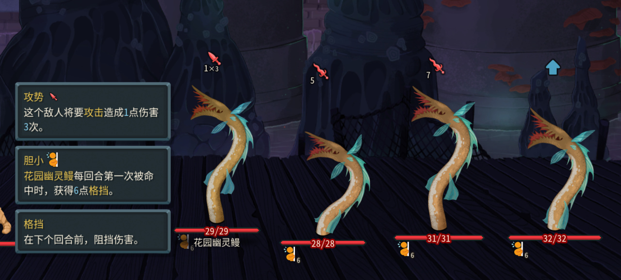 四个高攻击意图的花园幽灵鳗组成,自身有胆小buff,每回合第一次被攻击,就会缩下去并且获得格挡,同时每个幽灵鳗还会成长加攻击力。在一层卡组相对较弱的时候,很容易压低你的血线,需要抓AOE或者高单体伤害针对,比如战士的旋风斩和重锤。