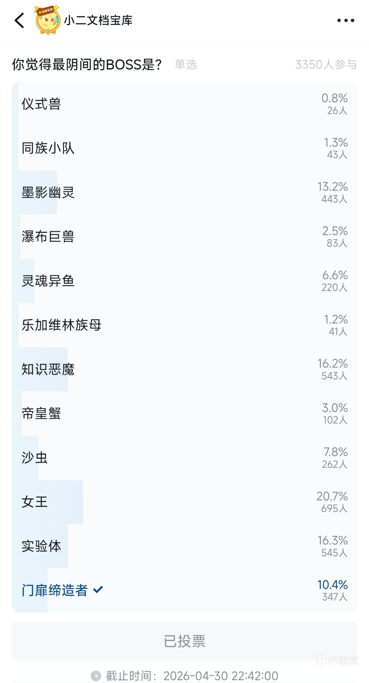 在开始这期内容之前,先来看看上期首领篇8小时的投票结果,一层墨影幽灵凭借逆天机制,拿下了一层的桂冠,联机模式的层数感觉设置得有点太高了。二层不断让二选一的知识恶魔遥遥领先,启动慢就可以回塔底了。三层的女王凭借特殊的锁牌机制,超过了三条命的实验体,成为三层和整个游戏目前最恶心的BOSS。