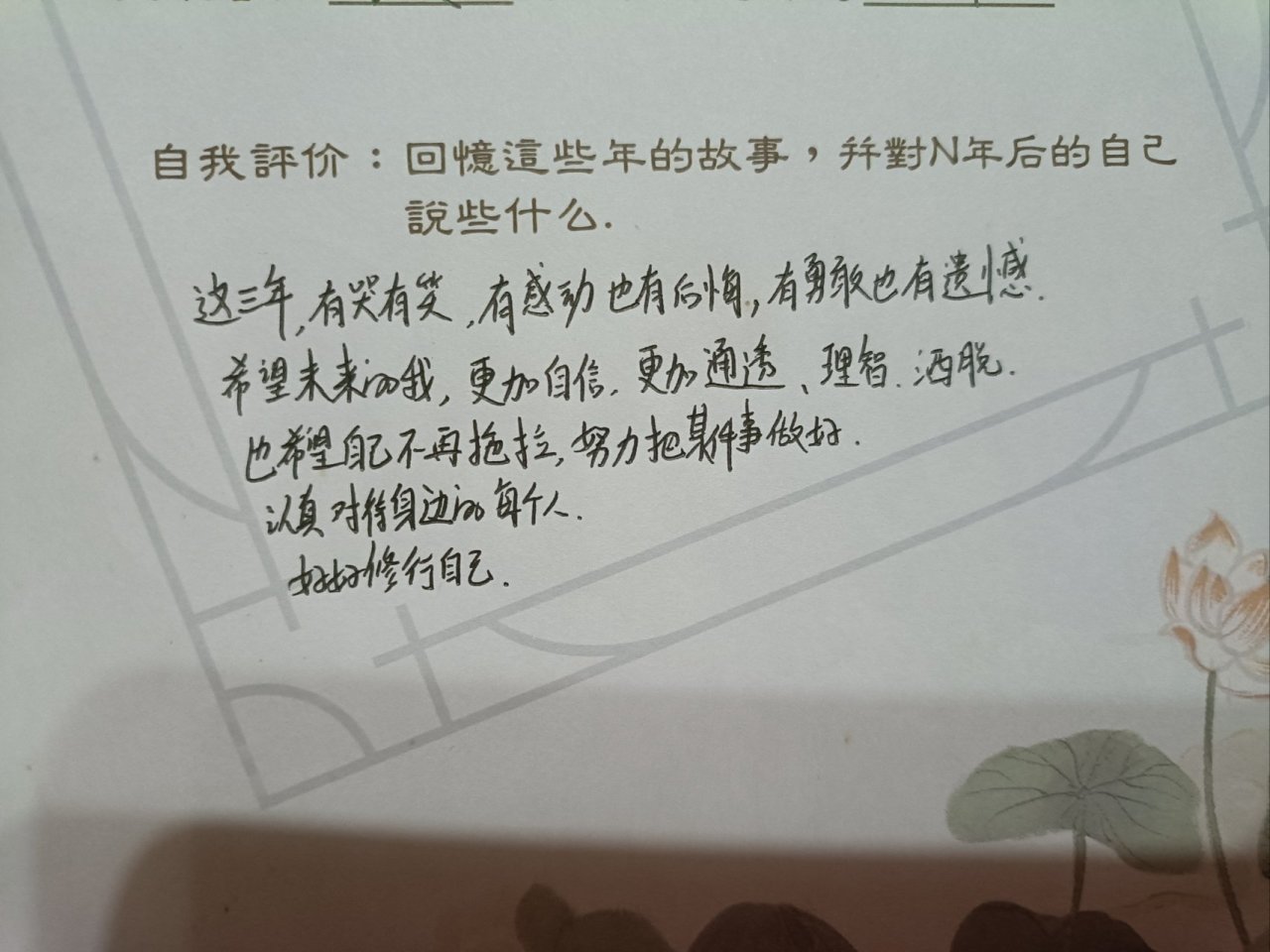 這是同學錄的第一頁——寫給自己的話。不知道當時的我是把“每件事”錯寫成“某件事”,還是說這個“某件事”是指代一件不想讓別人知道的事,總而言之,我忘了。如果是第二種,我認爲那個“我”最想做的事是寫作。