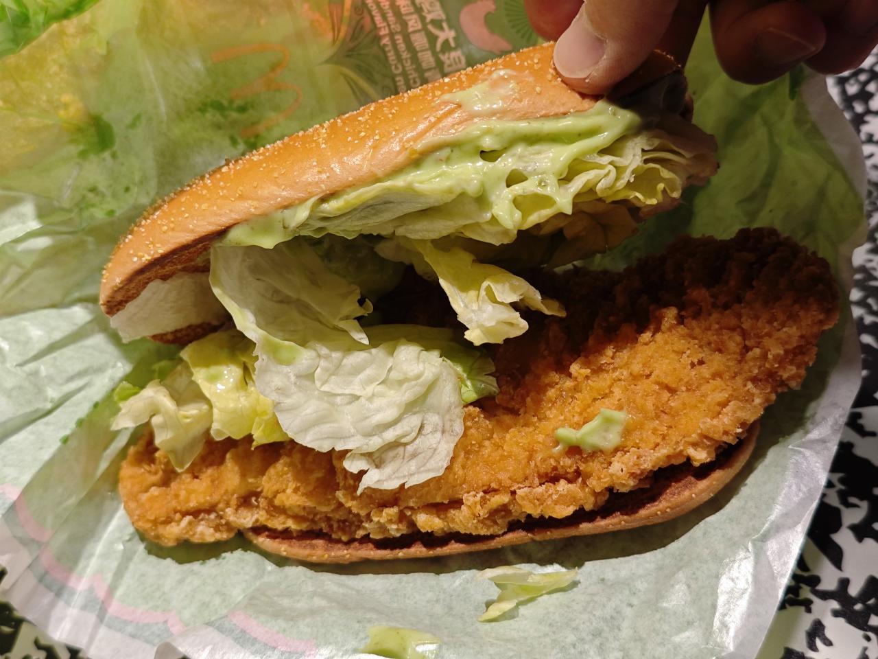 但是一口從上到下貫穿到底,麪包、醬汁、生菜與雞排糾纏在一起,反而會讓整體風味融合,頗有種揚長避短的感覺。生菜感覺比一般的漢堡要多一些,生菜的脆爽會中和很大一部分姜味的衝辣,配合上炸雞排的酥脆與微辣,進一步推高了醬汁賦予的酸甜辣味道,讓味道進一步融合,反而不會有單獨品嚐醬汁的刺激,更容易讓人接受一些。個人感覺還是很獨特的風味,值得一試。
