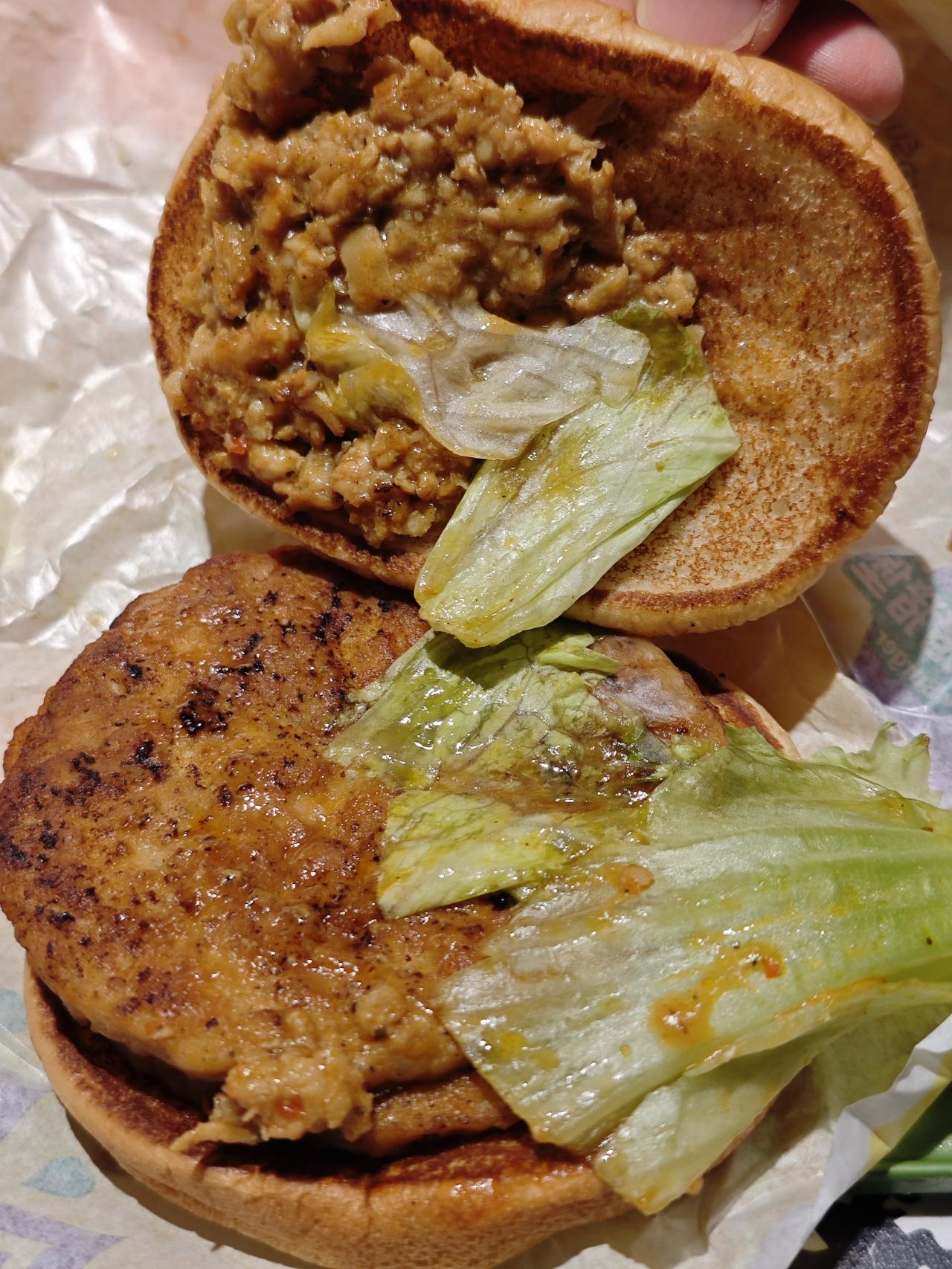 泰能打打拋豬豬堡,是一個雙層豬扒堡,和泰會浪不一樣,這個是偏甜酸辣的口,豬排上面的我原本以爲是蘑菇醬一類的,但喫了一口發現是雞肉粒,入口是甜酸味,後調有一點微微的辣。醬汁比較多比較稀,而且豬排也十分的軟嫩多汁,整體味道口感比泰會浪要更好一點,也更容易讓人接受,除了太小了沒啥缺點我覺得。