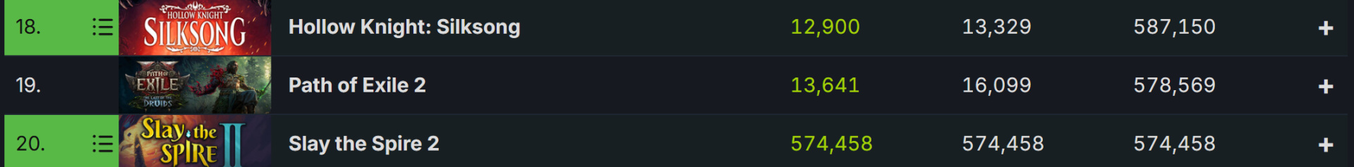 噶人们,《杀戮尖塔2》的热度持续火爆,得益于联机加持以及各种出圈meme(听我说谢谢鸡哥)效应,在周末屡创在线新高,目前已经来到了Steam总榜前二十的位置,逼近《丝之歌》(考虑到前者是真·单机,含金量更夸张)。