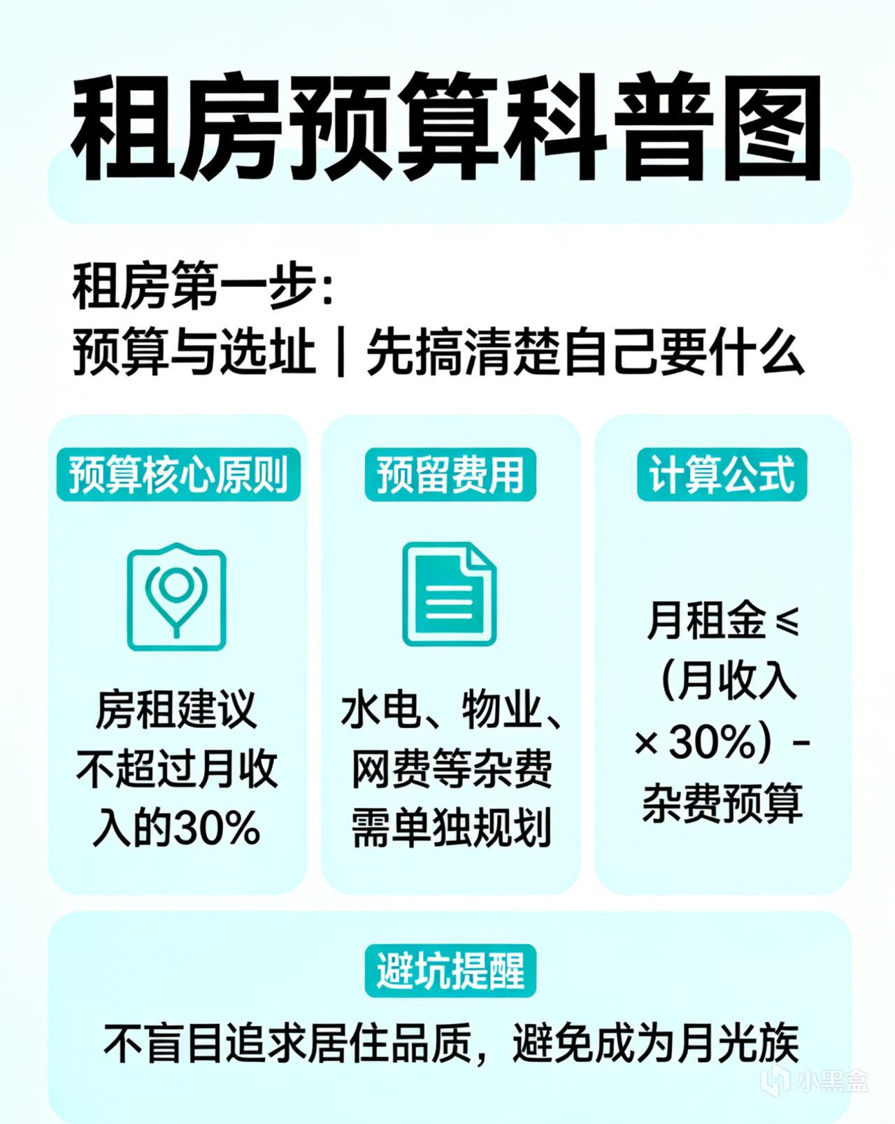 ①预算:别超过收入的30% 房租建议不超过月收入的30%,还要预留水电、物业等杂费。