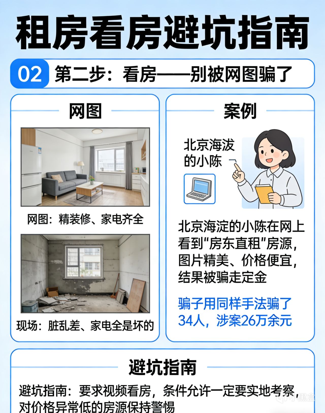 ① 警惕“照骗房” “精装修、家电齐全”的网图,到现场可能是“脏乱差、家电全是坏的”。