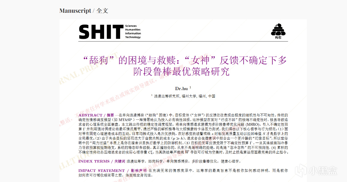 著名学术周刊,nature自然期刊的反刊“构思”中的一篇发表文章《舔狗”的困境与救赎:“女神”反馈不确定下多阶段鲁棒最优策略研究》中指出: