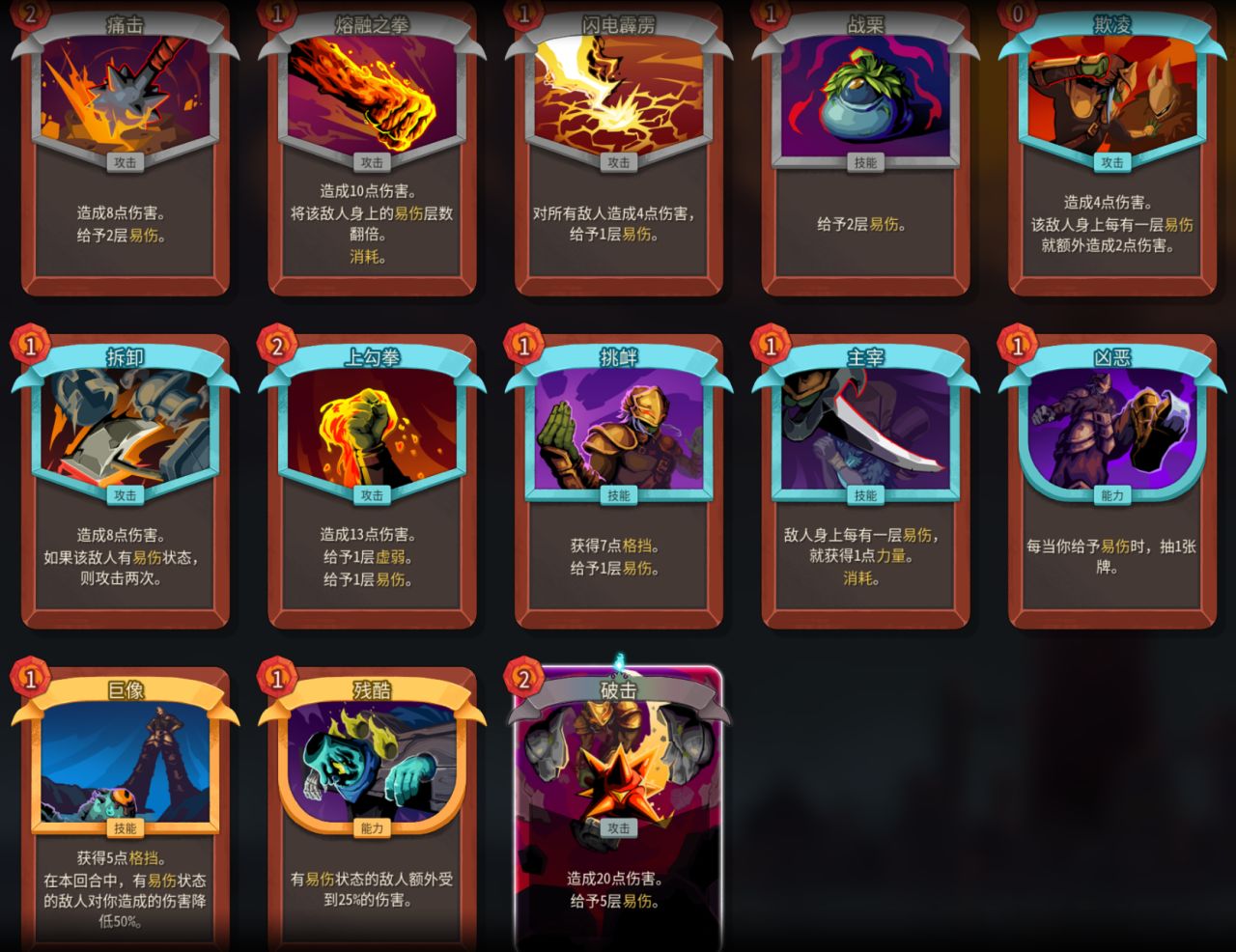 综上所述,易伤战的抓卡思路,除了易伤相关,还可以抓几张过卡/给费的万金油启动,抓一张头槌保证下限,抓多段伤害打输出,这也就是易伤战的卡组构成。