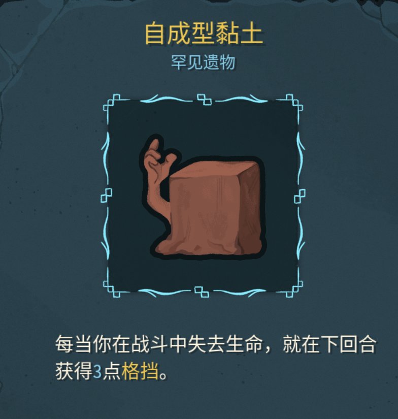 如果你开局的前几个遗物中有自成型黏土,就可以往自残方向靠了。有黏土的自残战才是完全体,真正契合自残战的遗物,一个遗物几乎解决了自残战的起防问题。