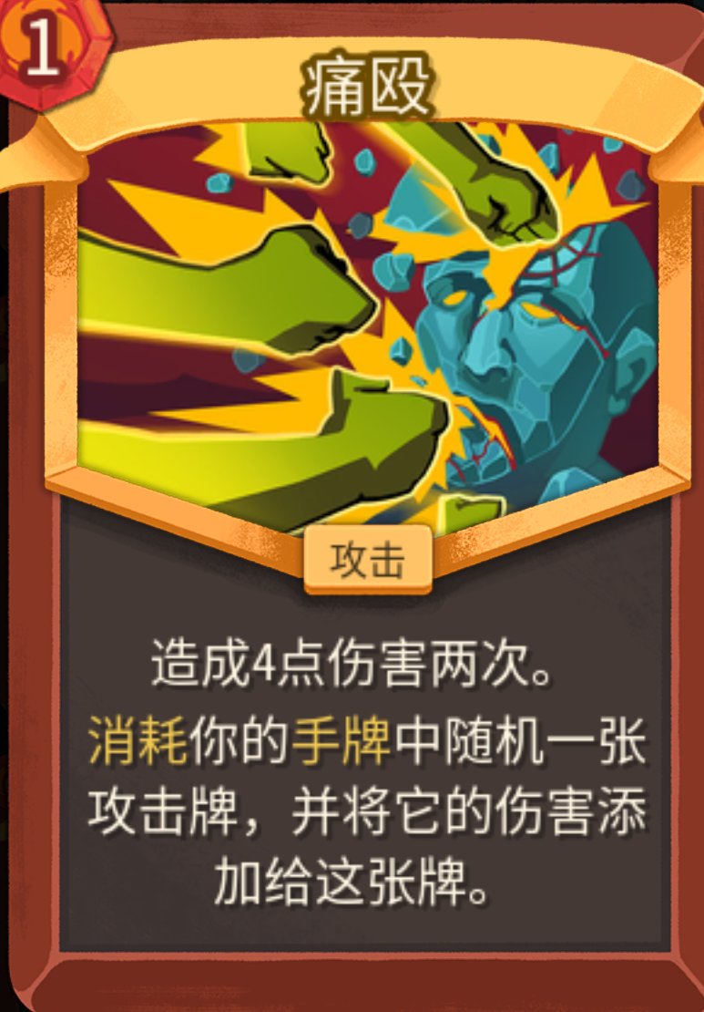 对于侧重力量的体系而言,痛殴再合适不过了。他的多段攻击可以吃到力量加成,他吃掉的卡又可以保留力量加成,等于下一次打出就是4次力量加成。但单独成体系还是非常困难。