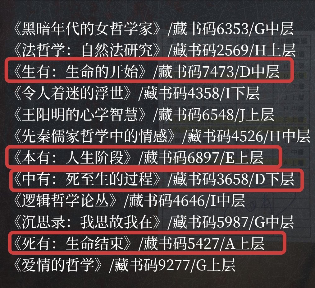 根据上图的线索,第1个柜子的第1层放死有,第3个柜子的第2层放生有,第3个柜子的第3层放中有,第4个柜子的第1层放本有
