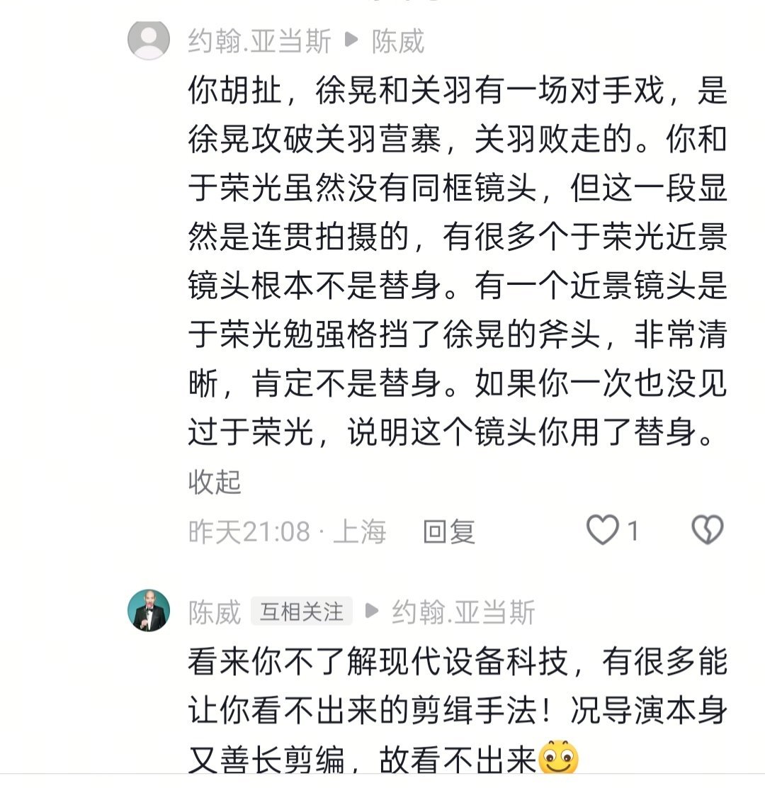 他说自己演徐晃这么久,从头到尾几乎没见过演关羽的于荣光