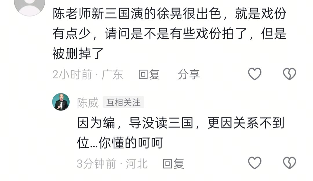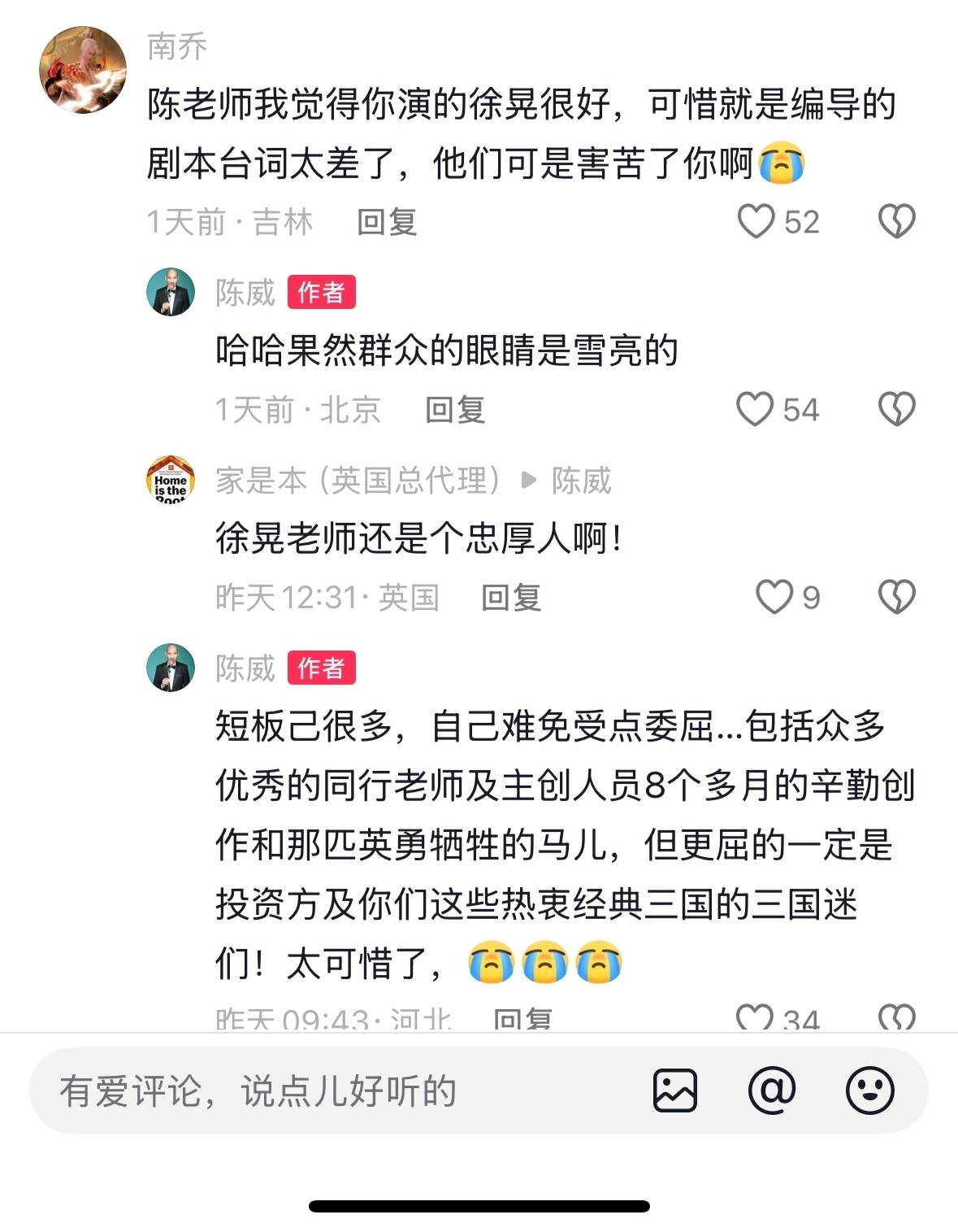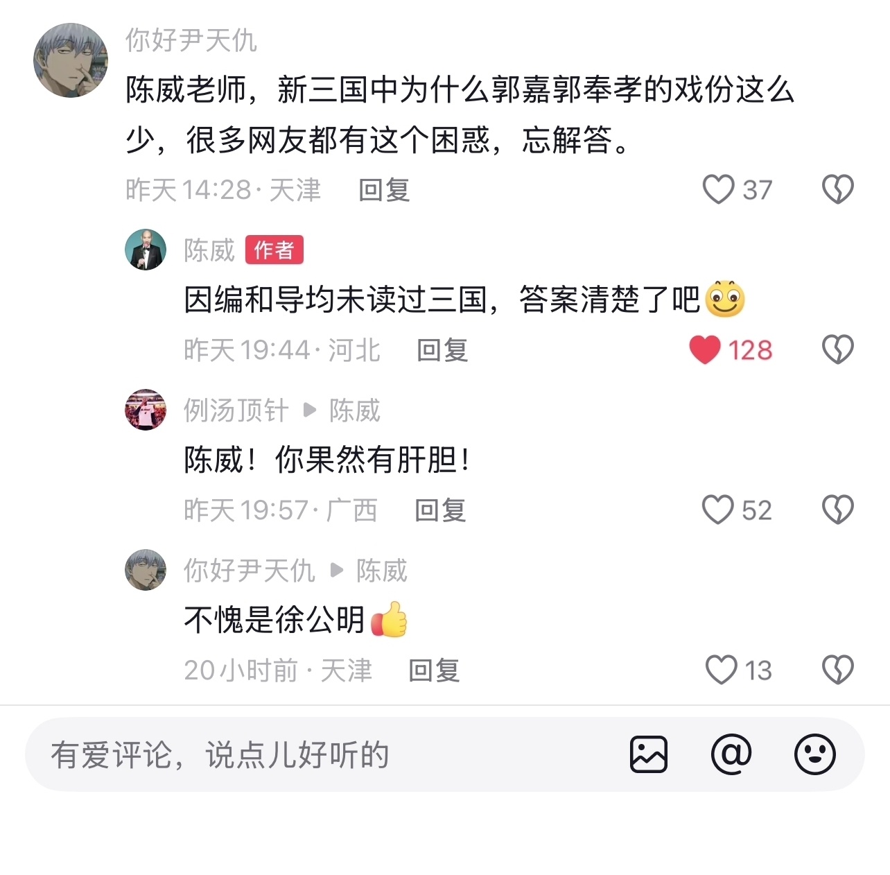 陈威还直言:这部剧的编剧、导演根本不懂三国,剧情、台词全是硬伤,一点不尊重原著。
