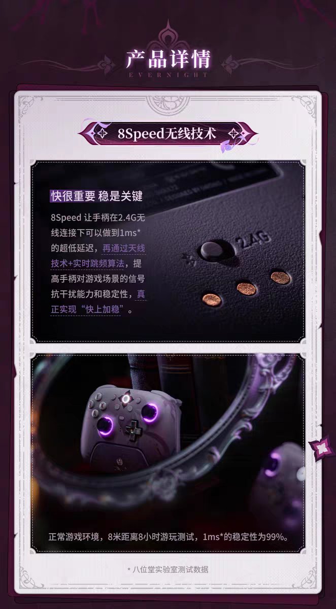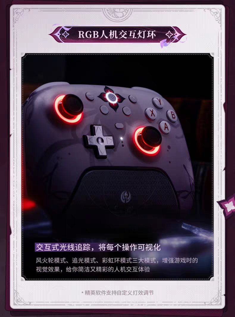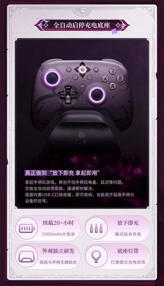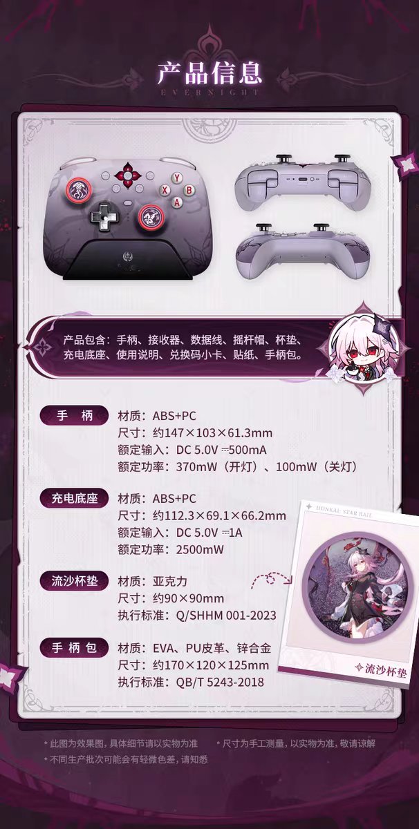 国内预售版本包含定制手柄、专属充电底座、2.4G无线接收器、数据线、替换摇杆帽,以及流沙亚克力杯垫、联名贴纸等周边赠品;而海外版「Evernight」则以「Collector's Bundle」形式发售,额外配备便携收纳盒与角色主题纹身贴,2025年9月开启预购后,于10月至11月陆续登陆美国、欧洲等地区,售价约70美元(约合人民币500元),兼容Windows、macOS、iOS、Android及Steam平台。