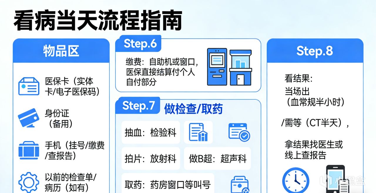 Step 7:做检查/取药 · 抽血:去检验科 · 拍片:去放射科 · 做B超:去超声科 · 取药:去药房窗口,等叫号