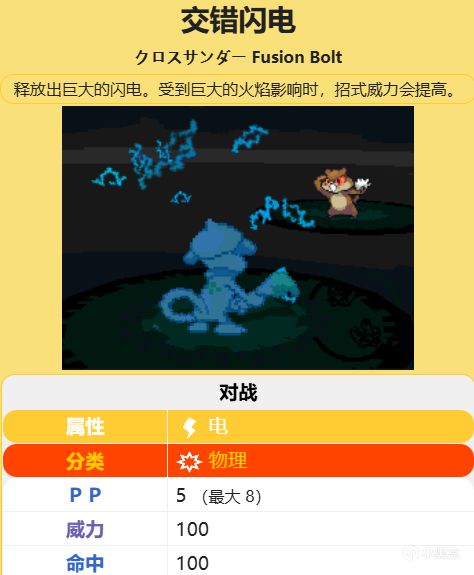 还有一个算是比较特权的地方就是他会交错闪电,这个技能效果是如果本回合上一个成功使用的招式是交错火焰,那么威力翻倍,也就是200威力。可以跟莱希拉姆在神站里打打配合(实际上屁用没有,不如我盖欧卡大哥直接喷水)