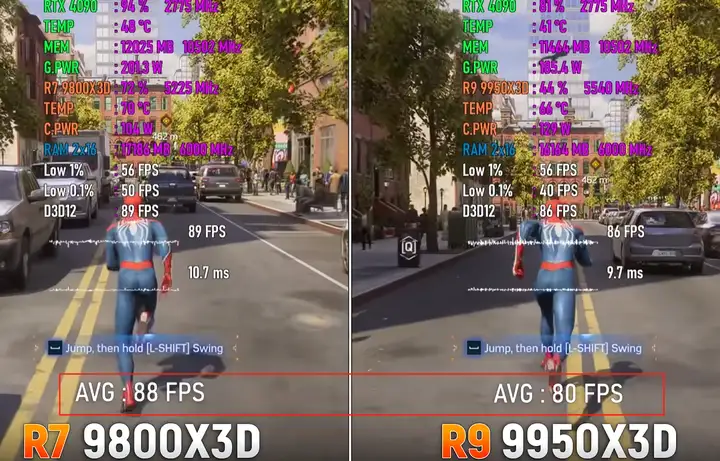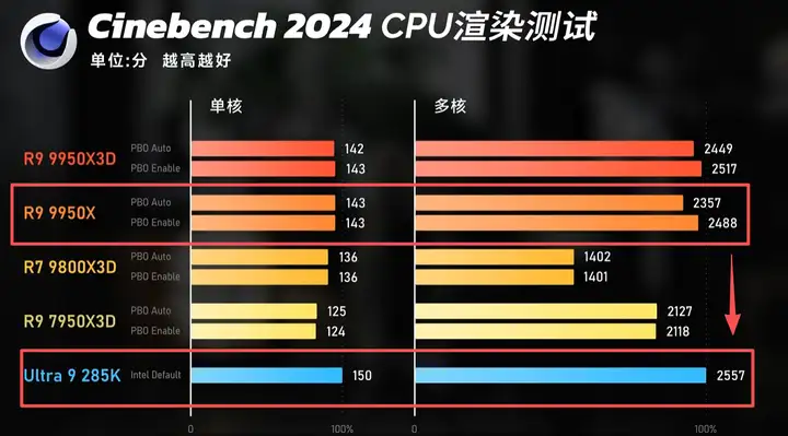 且由于9950X是两组核心设计(8+8),核间内部存在沟通延迟,所以一般来讲,游戏性能不如9800X3D!