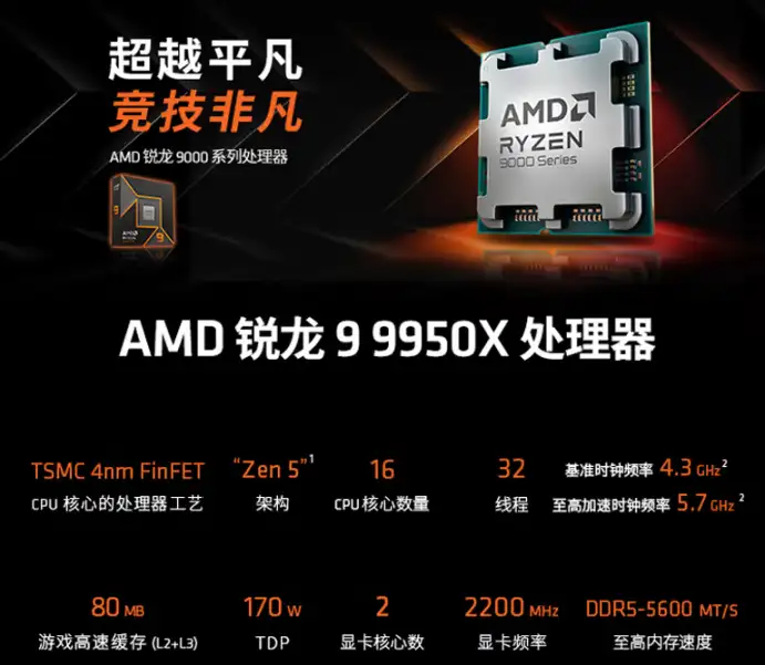 R9 9950X 16核心32线程(约2953元,建议搭配B850/X870E主板):