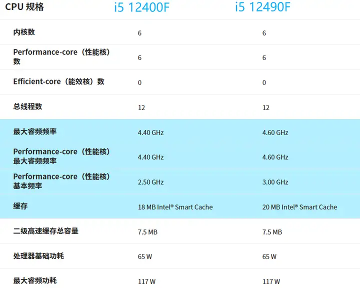 市面上还有i5 12490F,是国内特供版,其频率、缓存要更高一些: