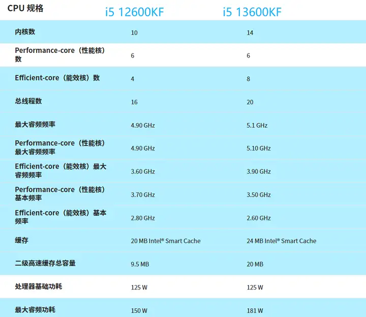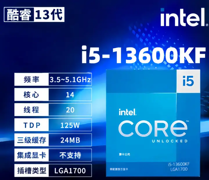 i5 13600KF 14核心20线程(约1288元,建议搭配240W以上供电的B760主板):