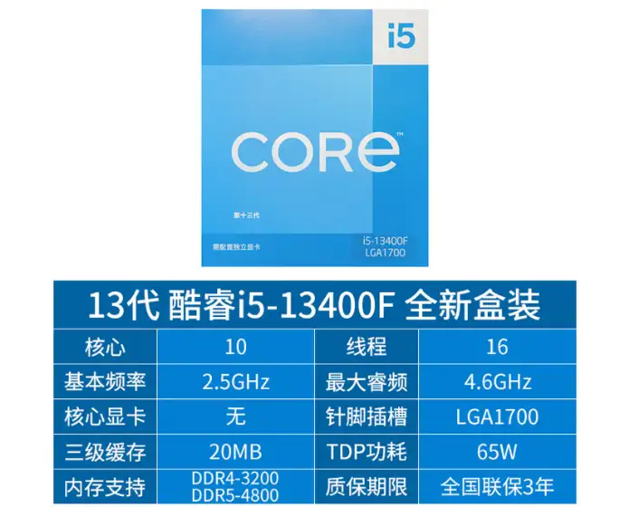 i5 13400F 10核心16线程(约929元,建议搭配H610M/B760M主板):