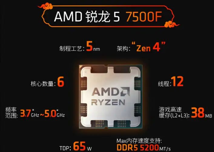 R5 7500F 6核心12线程(约767元,建议搭配A620/B650主板):