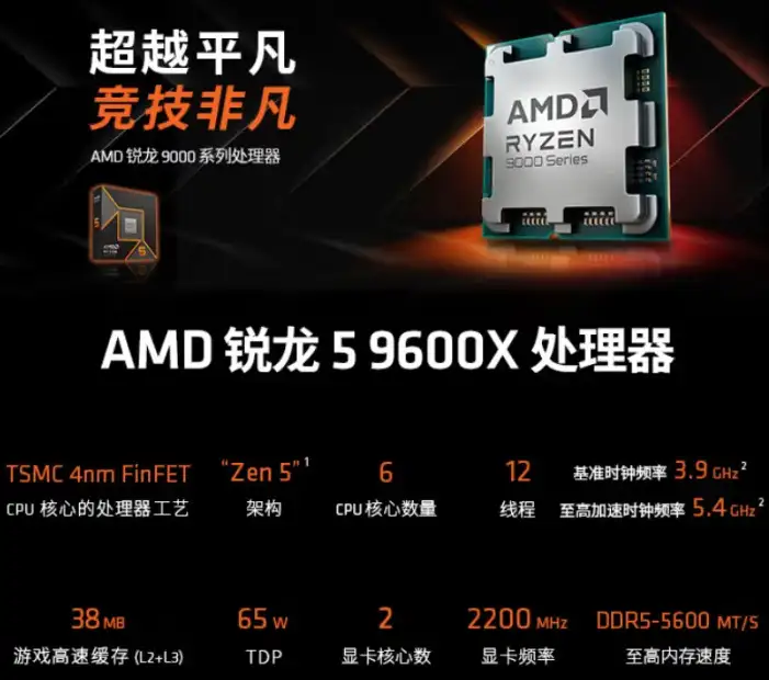 R5 9600X 6核心12线程(约1199元,建议搭配B650/B850主板):