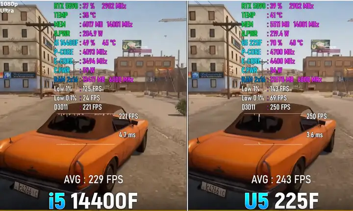 得益于更高的频率,大部分游戏表现中,U5 225F更胜一筹: