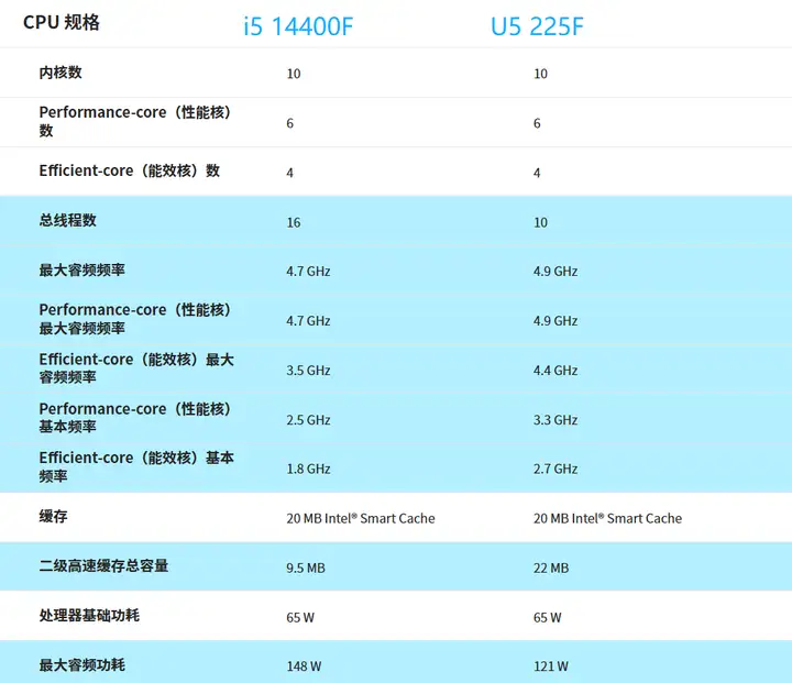 U5 225F可看作i5 14400F的功耗优化版本,两者参数很接近: