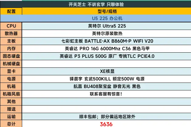 此外可以考虑U5 225——没有F后缀,意为带核显。可以不加装独立显卡就能直接亮机,很适合搭设入门核显办公整机: