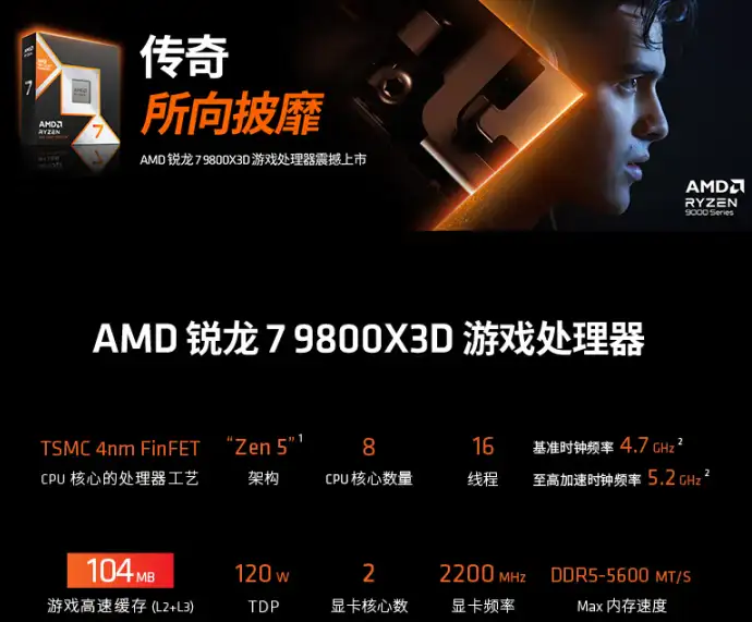 R7 9800X3D 8核心16线程(约2769元,建议搭配B650/B850/X870E主板):