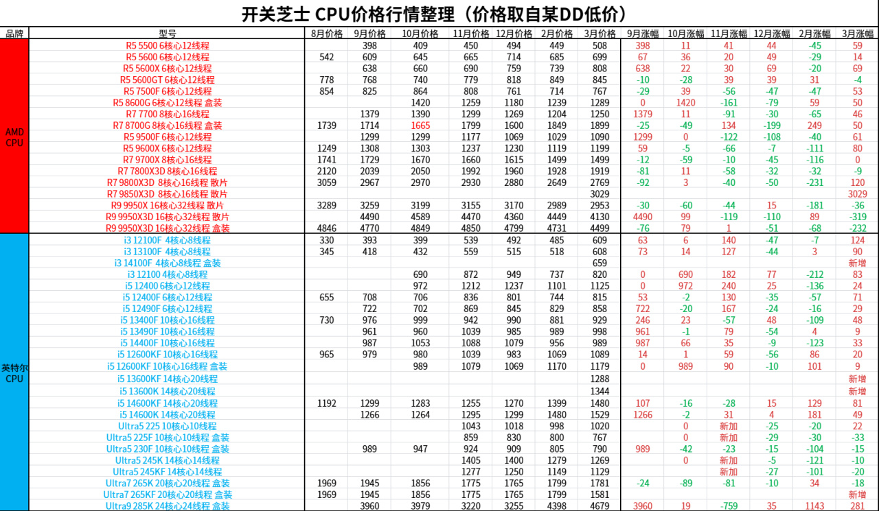 1、AMD入门主流CPU进一步涨价,如5600、7500F、9600X等