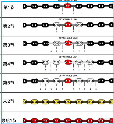 结合处链环涂红,两侧用不同数量的白色链环代表节数,船员在甲板上一眼就能判断水下链条长度。