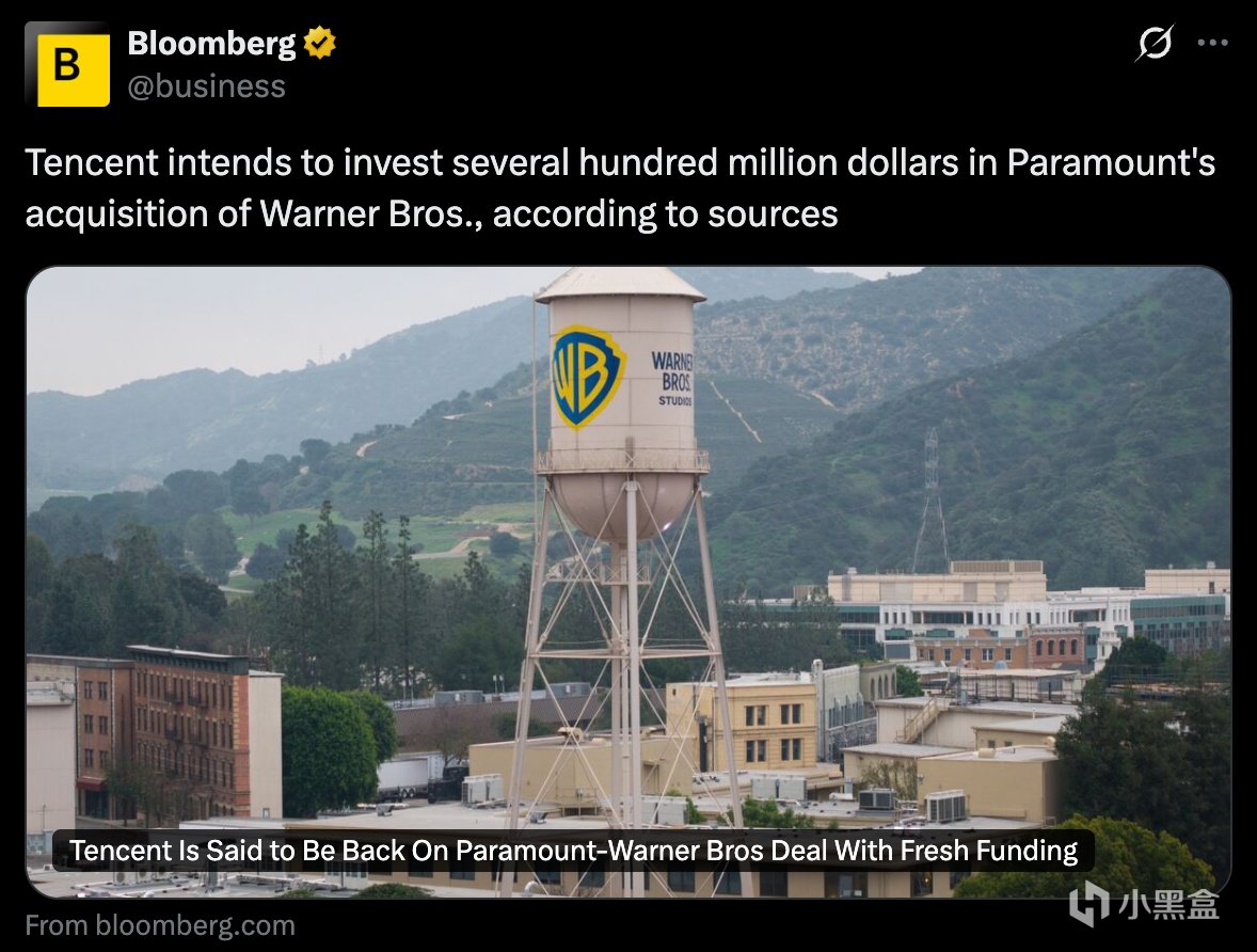 据彭博社报道,腾讯计划在派拉蒙天舞公司(Paramount Skydance)收购华纳兄弟探索公司(Warner Bros. Discovery)的交易中投资数亿美元。