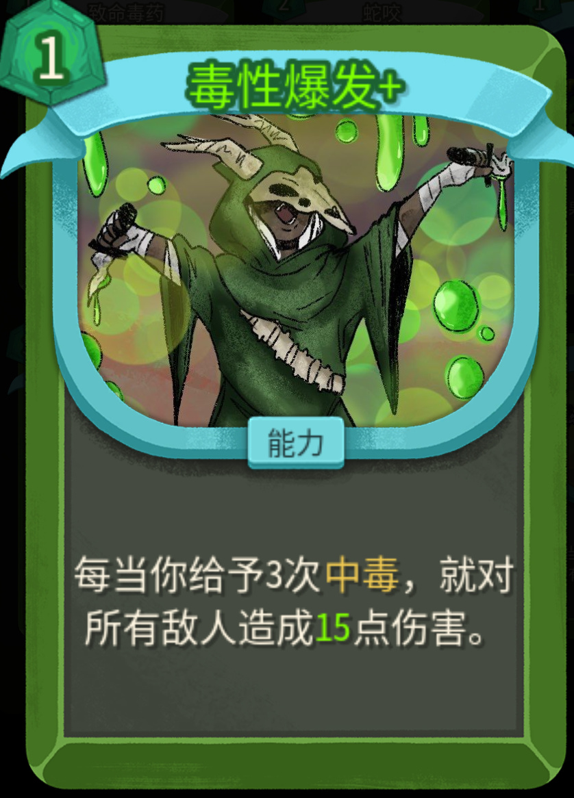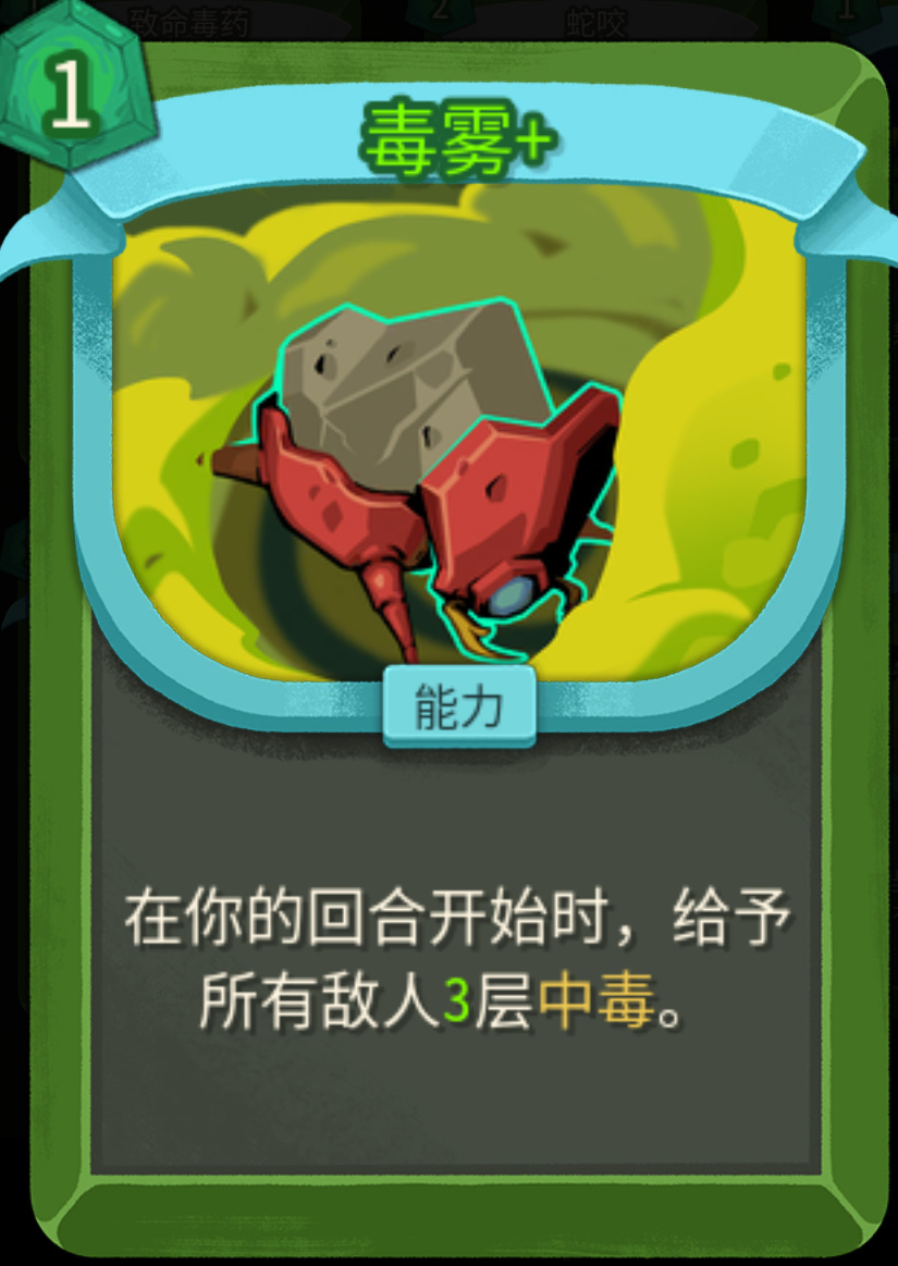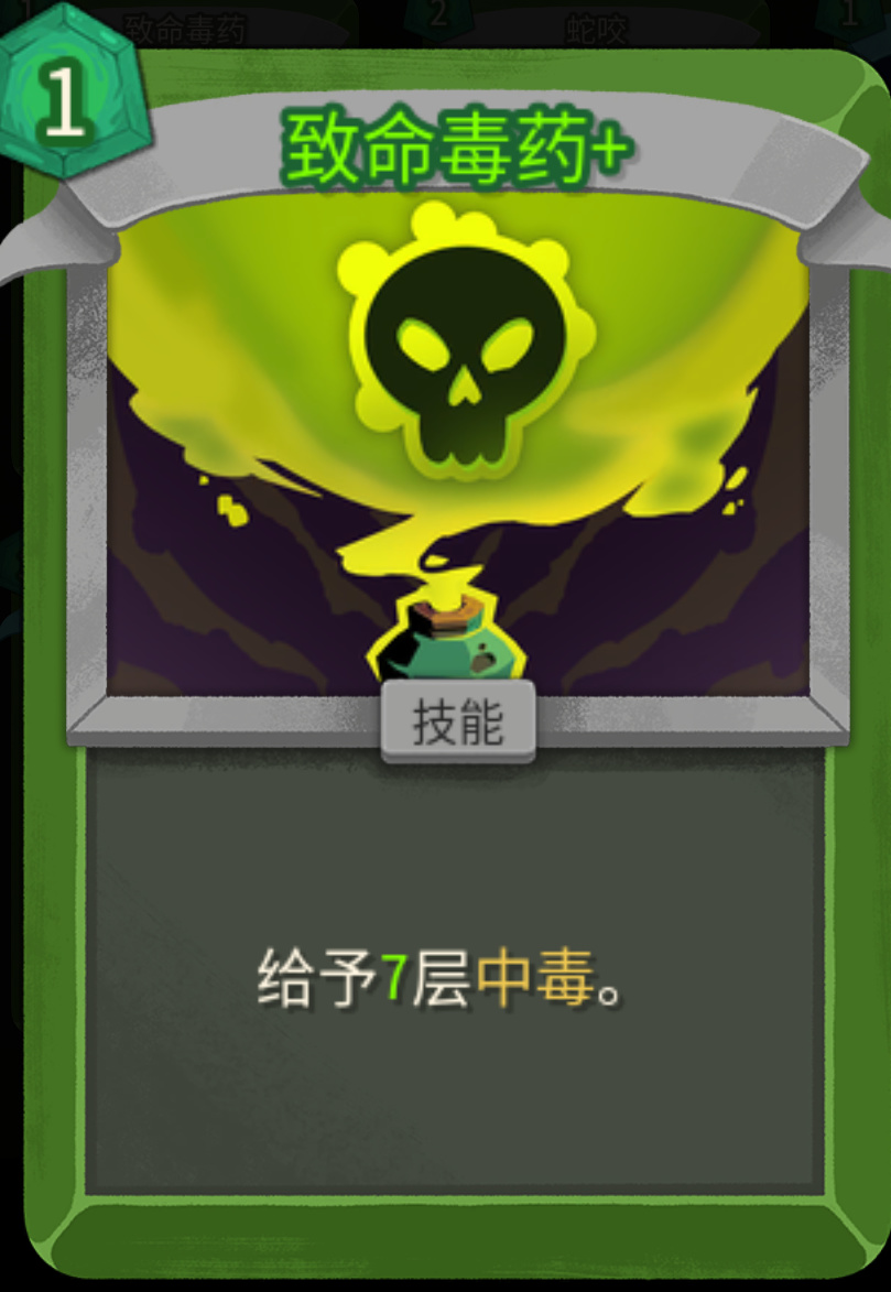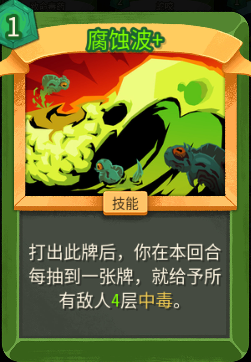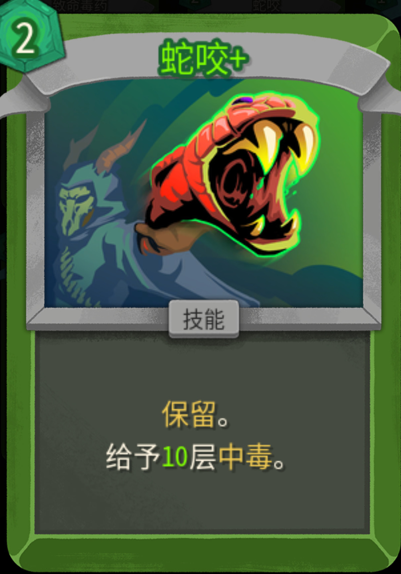 没升级之前,1费每回合开始群体叠2层;升级之后1费,每回合额外多叠1层,既能群体叠毒,又能破敌人的人工制品(免疫负面效果)。不管是单怪还是群怪都适用,低进阶拿到基本可以保你刷完一层怪物,二代群怪数量大幅上升,第一张优先级很高。