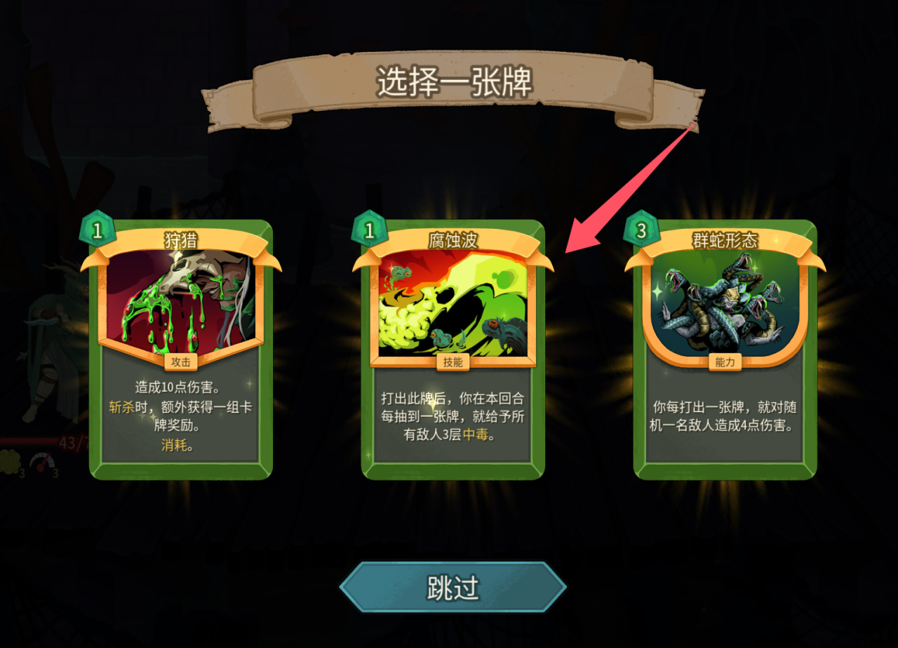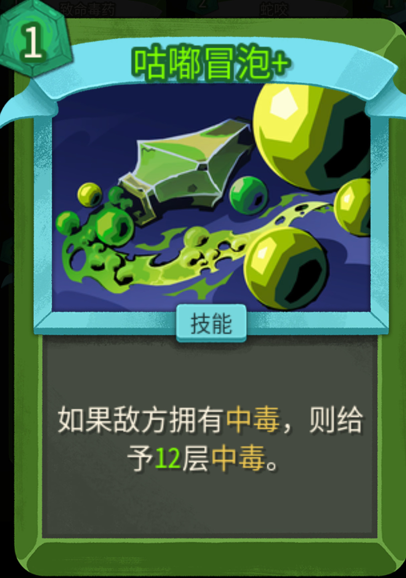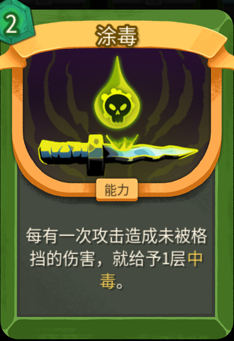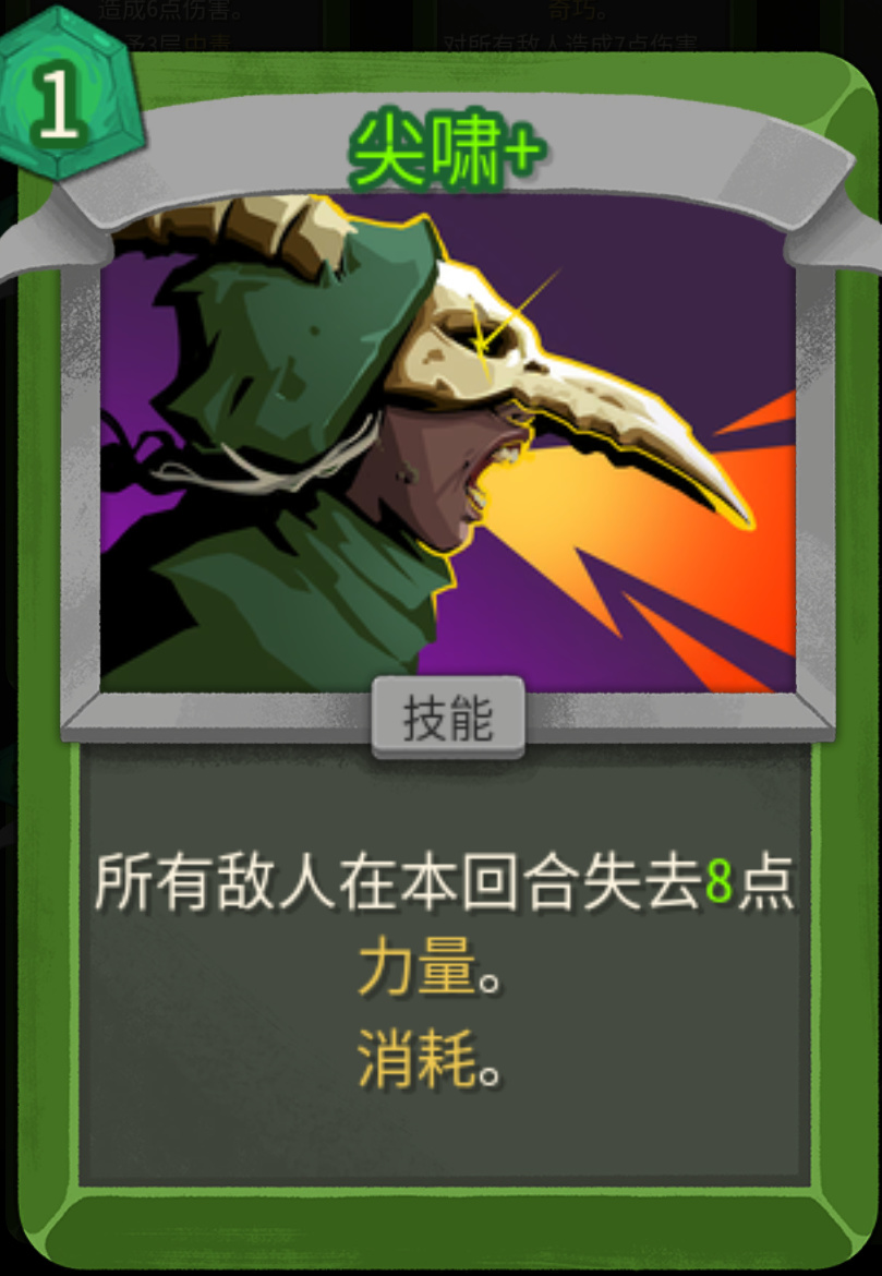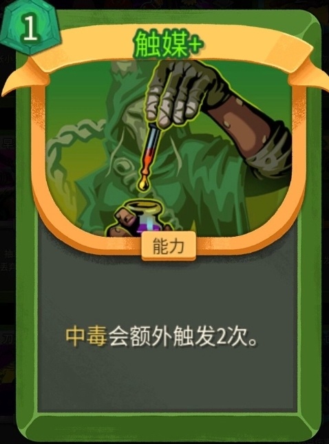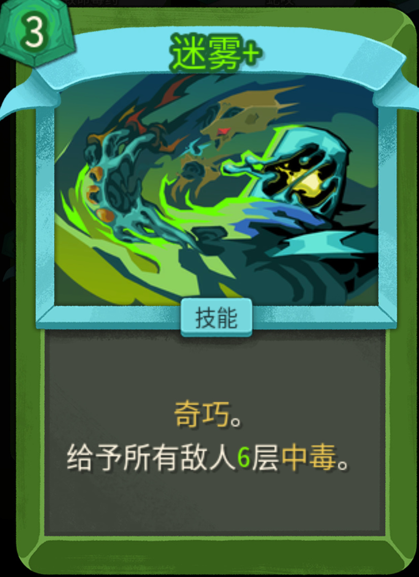 没升级之前,1费每回合开始群体叠2层;升级之后1费,每回合额外多叠1层,既能群体叠毒,又能破敌人的人工制品(免疫负面效果)。不管是单怪还是群怪都适用,低进阶拿到基本可以保你刷完一层怪物,二代群怪数量大幅上升,第一张优先级很高。