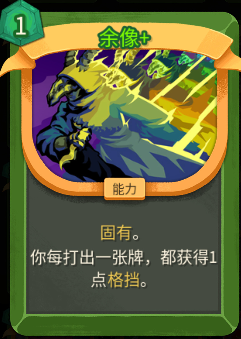 余像的效果是更适合高频输出的小刀猎的,放在下毒猎其实一点儿也不弱。能力卡还能升级成固有,稳定提升防御,很给力,萌新可以无脑抓一下手补防御端。