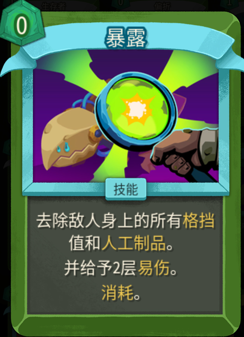 这两都是消耗卡我就放一块讲了,尖啸在群怪和多段伤害的表现十分有优异,可以一层用到三层。暴露是新加入的体系卡,可以直接移除对方身上的格挡和人工制品,还附送易伤,下毒体系这两都可以抓一张。