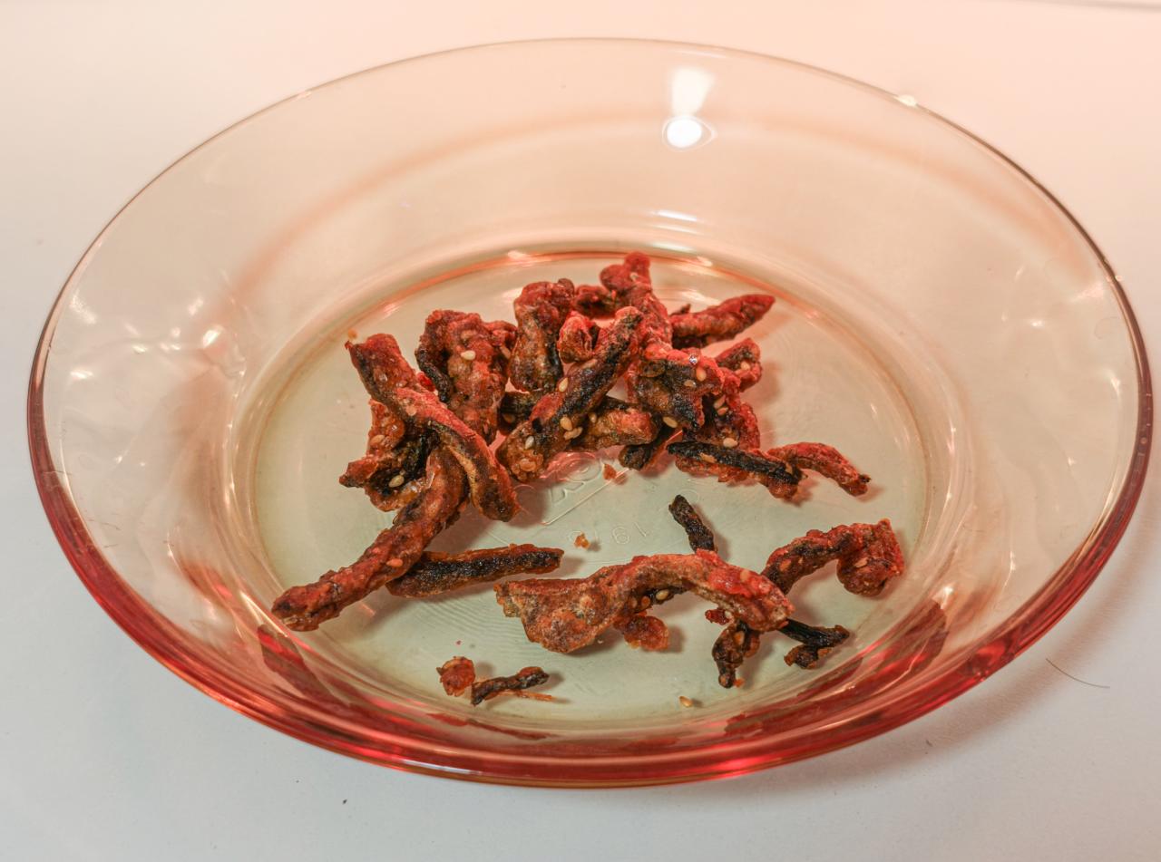 本来不抱什么希望,没想到味道相当好!说是香辣,但甜鲜味蛮足的,仔细看还裹了芝麻,很好吃!